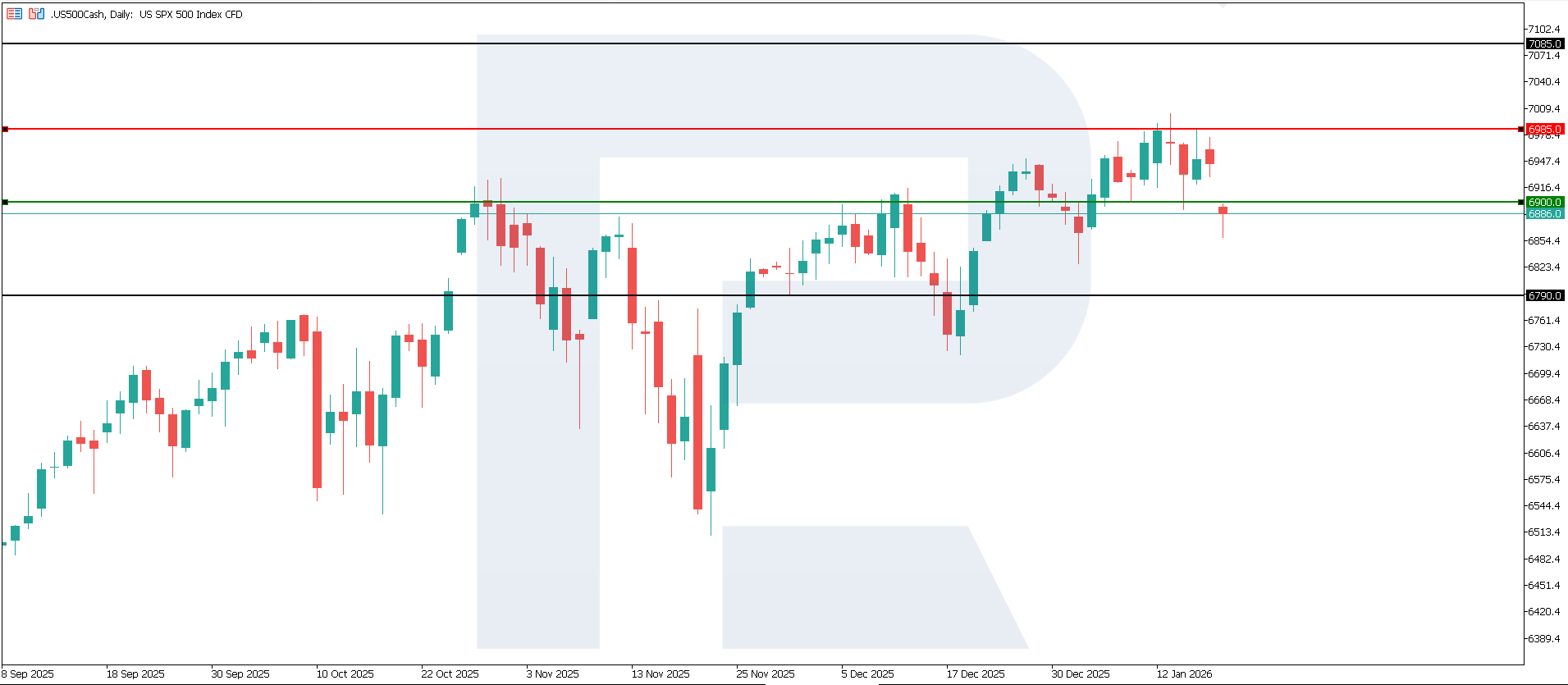 ดัชนี US 500 ได้หลุดต่ำกว่าแนวรับที่ระดับ 6,900.0 โดยมีแนวต้านก่อตัวขึ้นที่ระดับ 6,985.0 แม้ว่าดัชนียังคงอยู่ในแนวโน้มขาขึ้น แต่เป้าหมายขาลงที่ใกล้ที่สุดอาจอยู่บริเวณ 6,790.0
