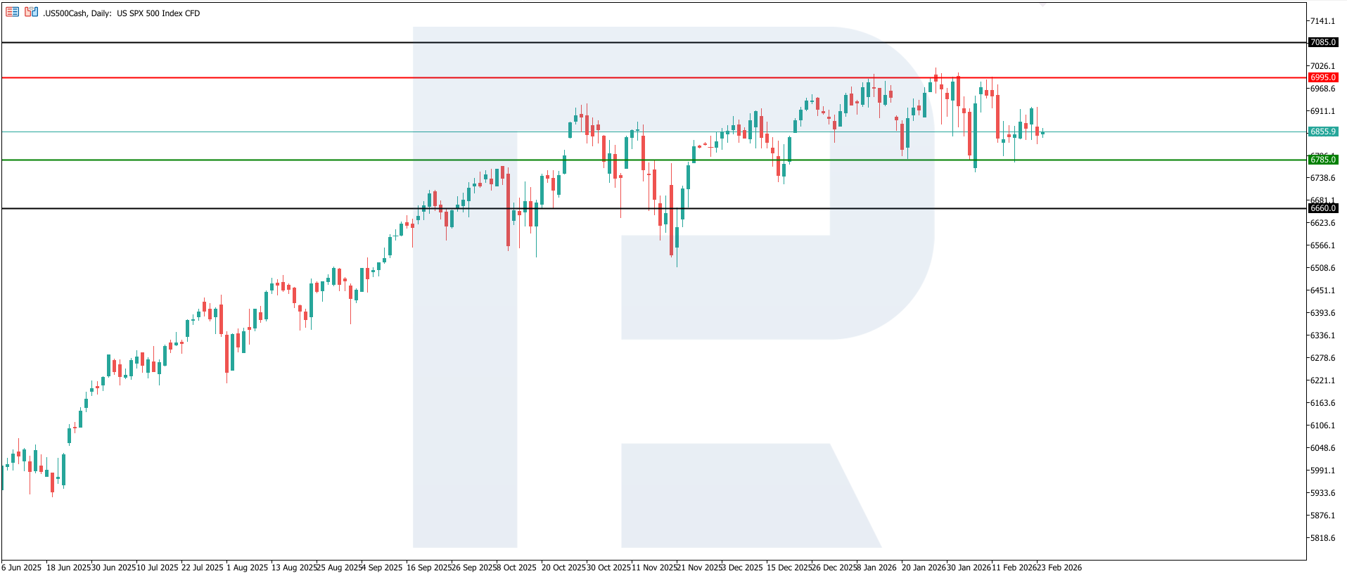 ดัชนี US 500 ได้ก่อตัวแนวรับที่ 6,785.0 และแนวต้านที่ 6,995.0 ในระยะนี้ ความผันผวนยังคงอยู่ในระดับสูง หลังจากเปลี่ยนเข้าสู่แนวโน้มขาลง ตลาดได้เข้าสู่ช่วงปรับฐานเชิงรุกและเข้าใกล้แนวต้านด้านบน