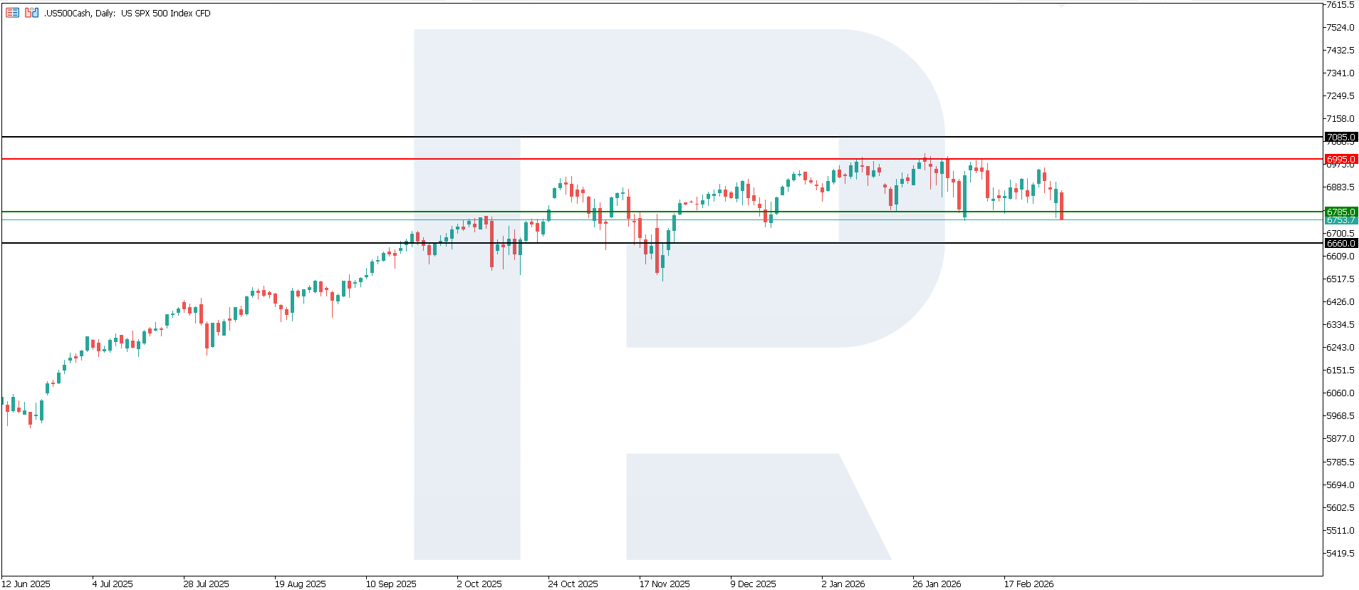 ดัชนี US 500 ได้ก่อตัวแนวรับบริเวณ 6,785.0 จุด ขณะที่แนวต้านสำคัญอยู่ราว 6,995.0 จุด