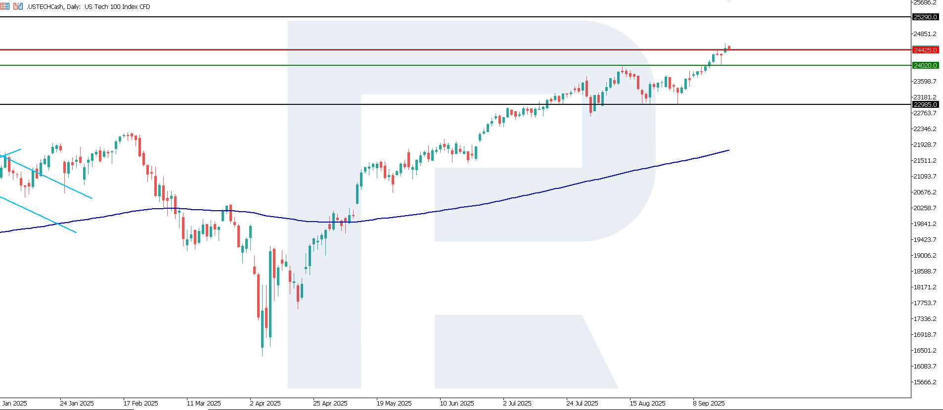 การวิเคราะห์ทางเทคนิคของ US Tech ประจำวันที่ 19 กันยายน 2025ดัชนี US Tech ทะลุแนวต้านเดิมที่ 24,425.0 ขึ้นไป โดยมีแนวรับใหม่ที่ 24,020.0 ขณะที่แนวต้านใหม่ยังไม่ก่อตัว แนวโน้มขาขึ้นมีแนวโน้มจะเป็นระยะกลาง โดยมีเป้าหมายถัดไปที่ 25,290.0
