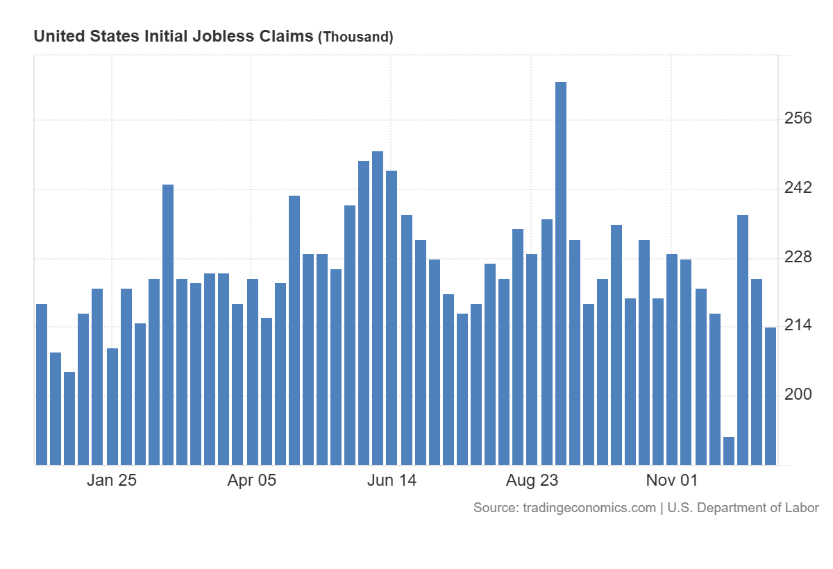 ตัวเลขล่าสุดออกมาที่ 214K ต่ำกว่าคาดการณ์ที่ 224K และลดลงจากค่าก่อนหน้าที่ 224K ซึ่งหมายความว่าผลลัพธ์ออกมาดีกว่าที่ตลาดคาดไว้ สะท้อนให้เห็นว่าตลาดแรงงานยังคงแข็งแกร่ง บริษัทต่าง ๆ ยังไม่ได้เร่งการเลิกจ้าง และรายได้ของครัวเรือนที่มีเสถียรภาพช่วยสนับสนุนการบริโภคของผู้บริโภค