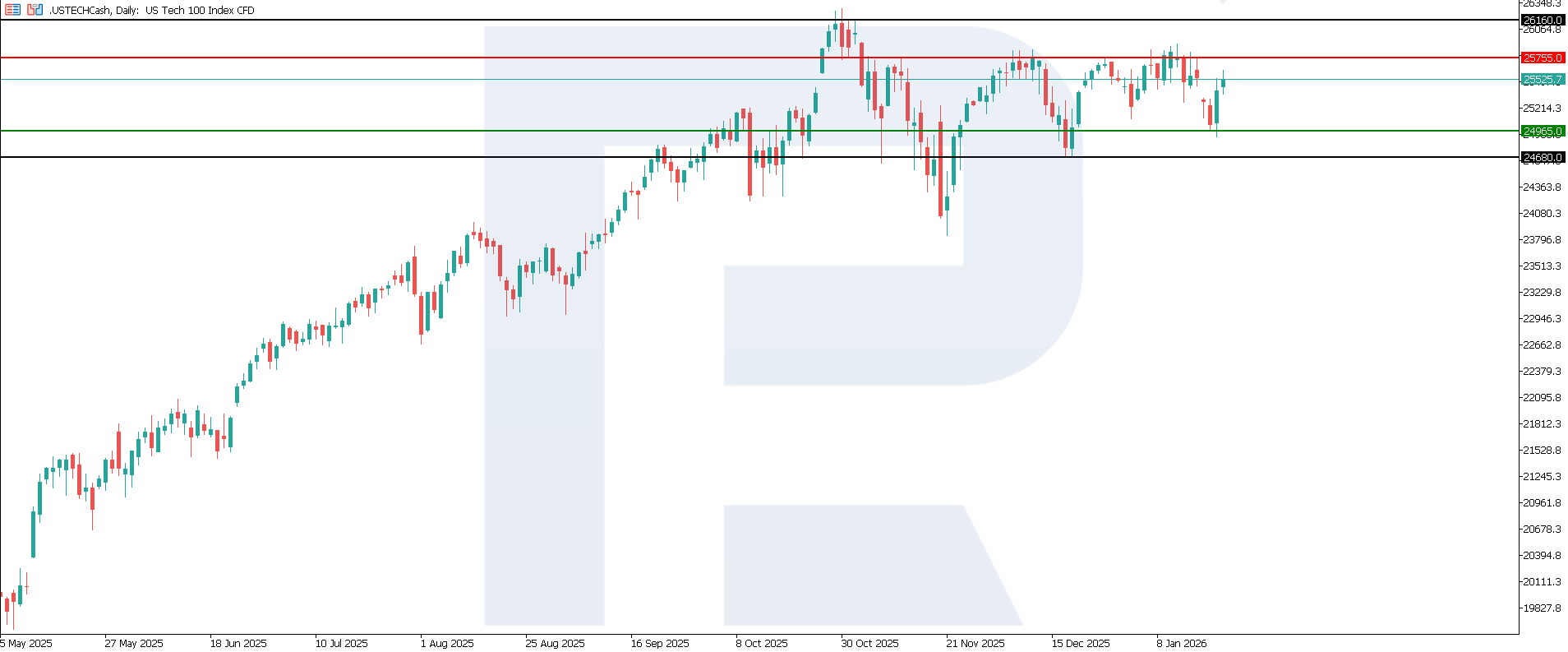 การวิเคราะห์ทางเทคนิคของ US Tech ประจำวันที่ 23 มกราคม 2026ดัชนี US Tech ได้เข้าสู่แนวโน้มแกว่งตัวออกด้านข้าง โดยมีแนวต้านที่ใกล้ที่สุดอยู่ที่ระดับ 25,755.0 และแนวรับขยับขึ้นมาที่ระดับ 24,965.0 อย่างไรก็ตาม ราคากำลังเคลื่อนตัวขึ้นเข้าใกล้แนวต้าน โดยมีความเป็นไปได้สูงที่จะเกิดการทะลุกรอบ เป้าหมายขาขึ้นอาจอยู่ที่ระดับ 26,160.0