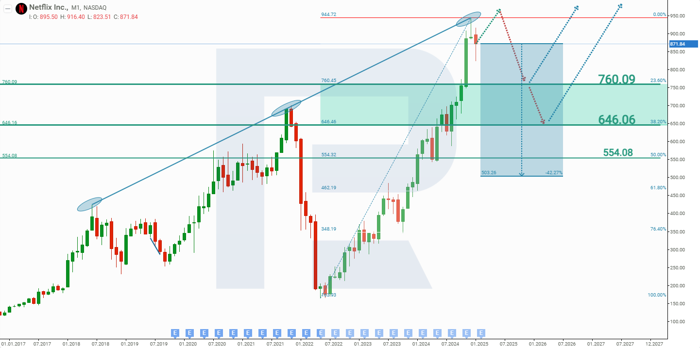 On the monthly timeframe, Netflix Inc.’s stock reached the 999 USD resistance level. Over the past two years, the company’s shares have skyrocketed 500%, with no significant corrections observed. Starting in November 2024, price growth accelerated, as typically seen at the final stage of an uptrend. Based on the current performance of Netflix Inc.’s stock, two potential scenarios are considered for 2025.