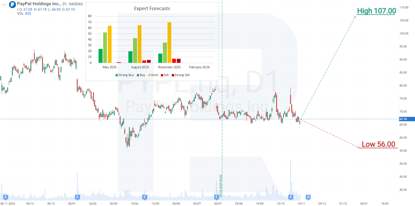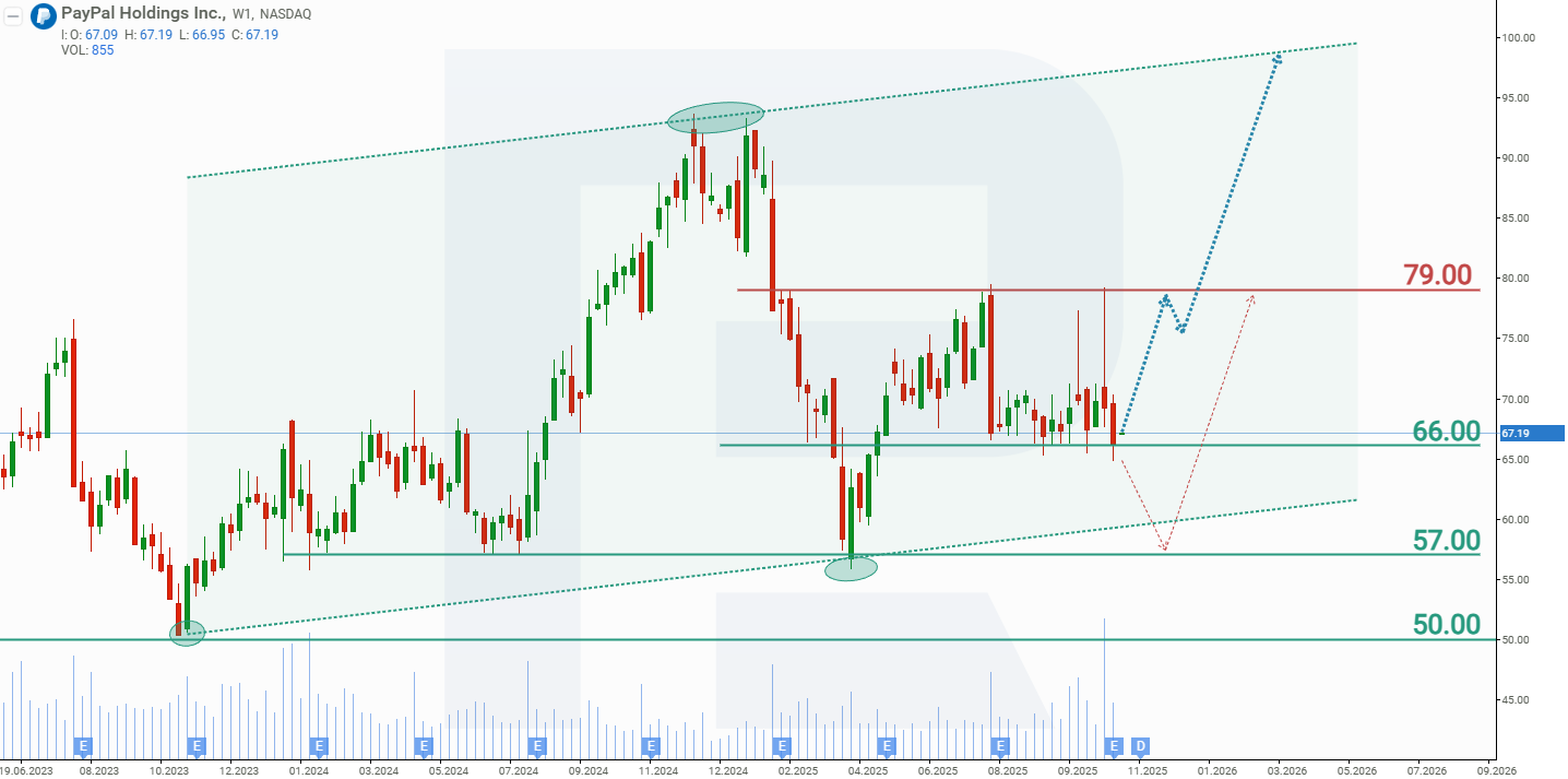 การเผยแพร่รายงานไตรมาส 3 ปี 2025 เพิ่มความผันผวนให้หุ้นของบริษัท แต่ยังไม่ทำให้เกิดการทะลุขึ้นหรือลงผ่านแนวรับหรือแนวต้านสำคัญที่ 66 และ 79 ดอลลาร์สหรัฐ อ้างอิงจากพฤติกรรมราคาปัจจุบันของหุ้น PayPal สถานการณ์ที่เป็นไปได้สำหรับปี 2025 มีดังนี้: