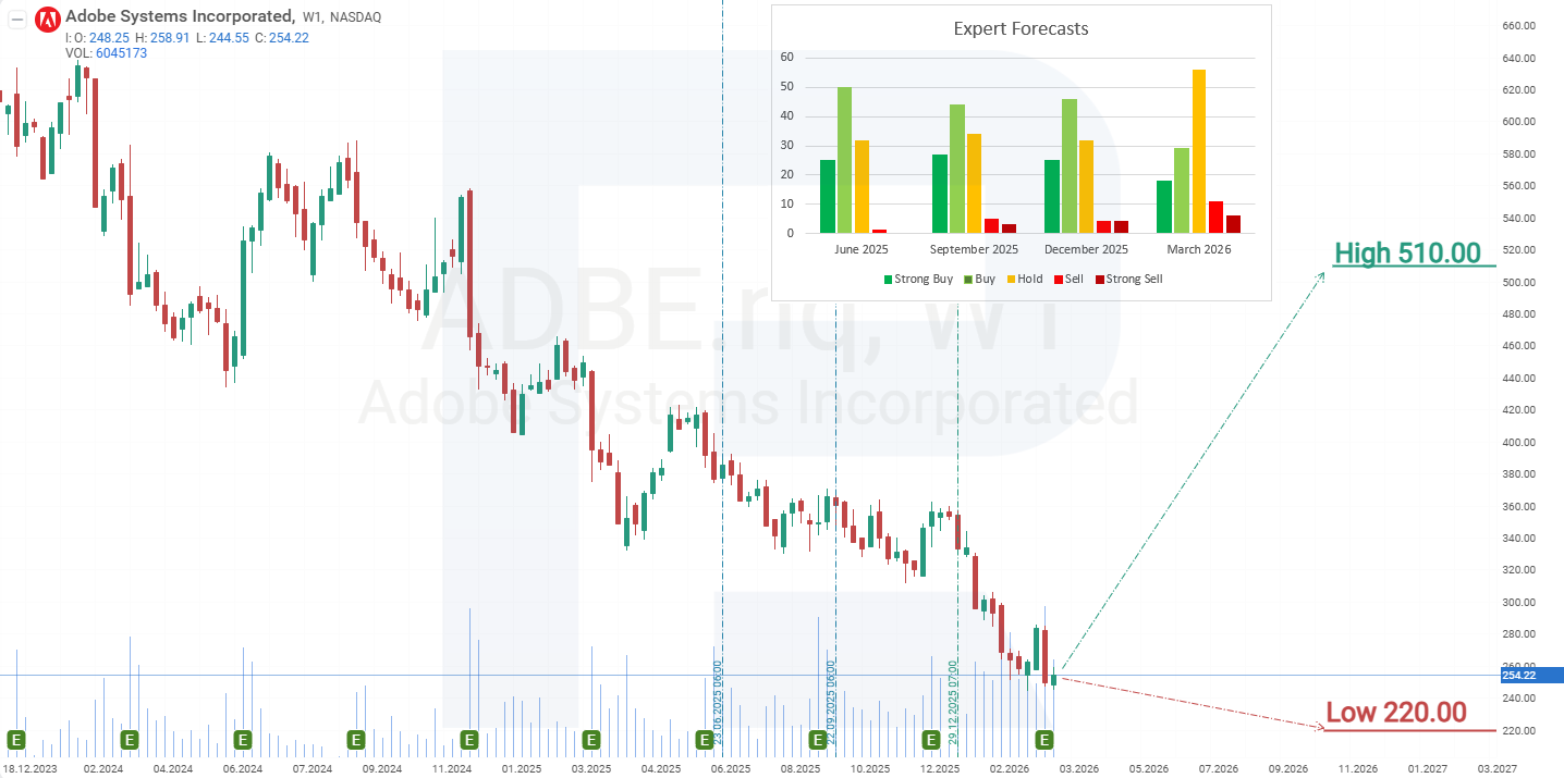 การคาดการณ์หลักสำหรับหุ้น Adobe คาดว่าจะทดสอบแนวรับที่ 170 ดอลลาร์สหรัฐ ก่อนที่จะดีดตัวขึ้นไปยังแนวต้านที่ 330 ดอลลาร์สหรัฐ การทะลุระดับนี้อาจทำหน้าที่เป็นตัวกระตุ้นสำหรับการปรับตัวขึ้นต่อไป โดยอาจผลักดันหุ้น ADBE ไปสู่ระดับ 420 ดอลลาร์สหรัฐ