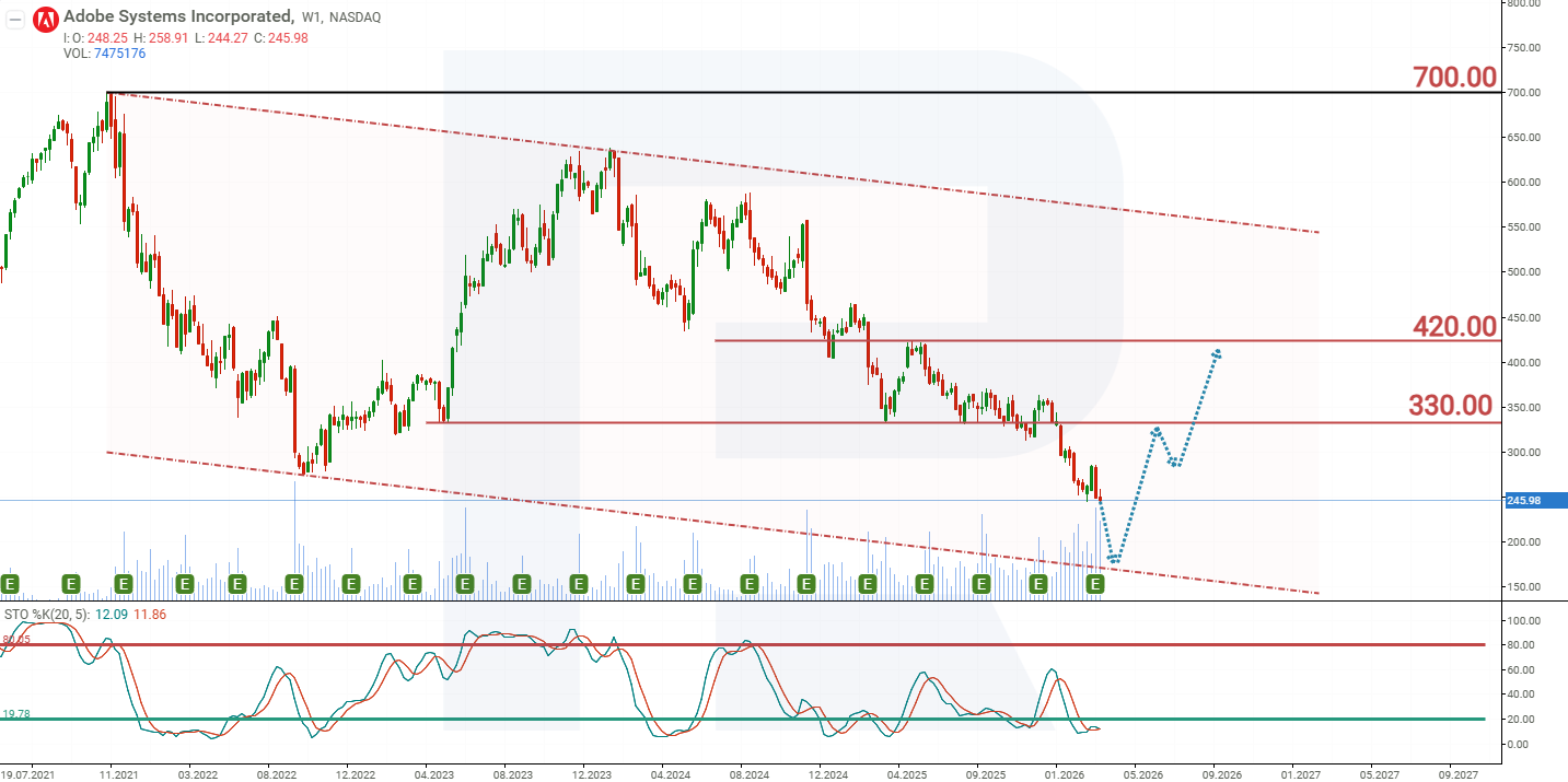 ในเชิงกราฟ ADBE กำลังเข้าใกล้ขอบล่างของช่องที่บริเวณประมาณ 150 ดอลลาร์สหรัฐ ซึ่งทำหน้าที่เป็นแนวรับ นอกจากนี้ อินดิเคเตอร์ Stochastic อยู่ในโซนขายมากเกินไป ซึ่งบ่งชี้ว่าแนวโน้มขาลงอาจใกล้สิ้นสุด และอาจเกิดการดีดตัวของราคาในไม่ช้า จากพลวัตปัจจุบันของหุ้น Adobe สถานการณ์ราคาที่เป็นไปได้สำหรับปี 2026 มีดังนี้: