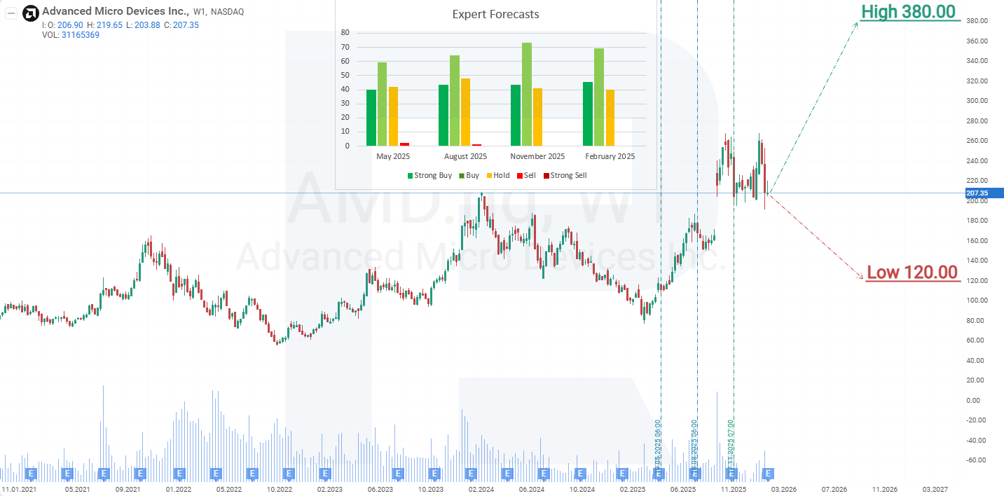 การคาดการณ์กรณีฐานสำหรับหุ้น Advanced Micro Devices ชี้ว่าราคาจะหลุดต่ำกว่าระดับแนวรับ 194 ดอลลาร์สหรัฐ จากนั้นปรับลงสู่ 150 ดอลลาร์สหรัฐ ที่ระดับนี้คาดว่าการปรับฐานจะสิ้นสุด และการฟื้นตัวของราคาหุ้น AMD ภายในแนวโน้มขาขึ้นที่กว้างขึ้นจะกลับมาเป้าหมายการเติบโตจะเป็นระดับแนวต้านที่ 340 ดอลลาร์สหรัฐ ความระมัดระวังของนักลงทุนเห็นได้ชัดท่ามกลางผลลัพธ์ที่ผสมผสานจากไตรมาสก่อน ซึ่งยอดขายไปจีนคิดเป็นสัดส่วนรายได้ที่สำคัญ นอกจากนี้ ความเชื่อมั่นของตลาดโดยรวมได้รับผลกระทบเชิงลบจากการพลาด EPS ของ Amazon เมื่อกำไรต่ำกว่าที่คาด ความสนใจของนักลงทุนอาจกลับมา หากราคาหุ้นลดลง และบริษัทยืนยันความต้องการที่ยั่งยืนสำหรับโซลูชัน AI และความสามารถในการแปลงความต้องการนี้เป็นกำไรและกระแสเงินสด