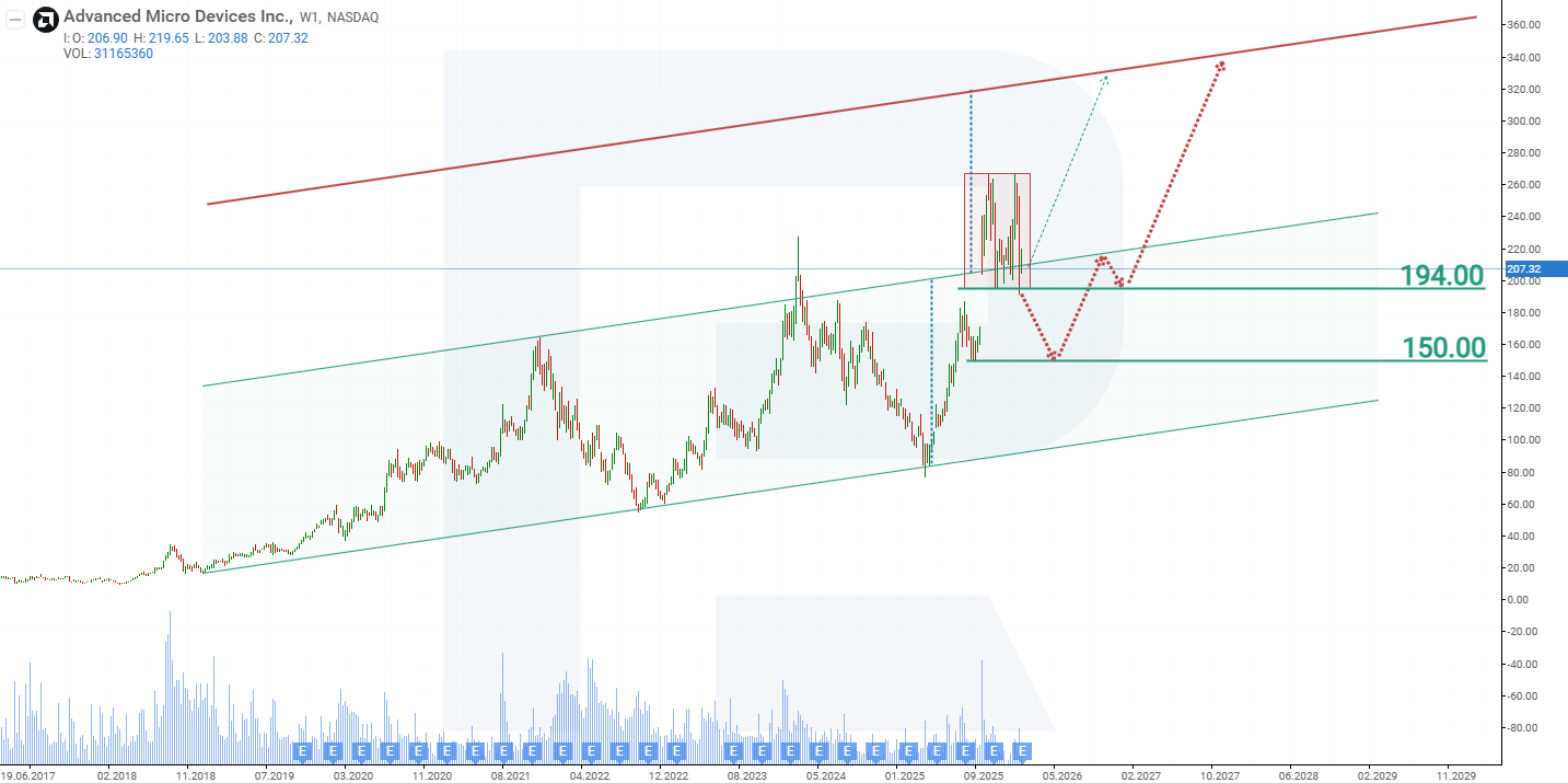 บนกราฟรายสัปดาห์ หุ้น Advanced Micro Devices ซื้อขายอยู่ในกรอบช่องขาขึ้นจนถึงเดือนตุลาคม 2025 ในวันที่ 6 ตุลาคม 2025 ข้อตกลงสำคัญระหว่าง AMD และ OpenAI เพื่อจัดหาชิป AI พร้อมตัวเลือกให้ OpenAI เข้าซื้อหุ้น AMD ได้สูงสุด 10% กระตุ้นให้ราคาหุ้น AMD พุ่งขึ้นอย่างรวดเร็ว ทำให้กรอบบนของช่องขาขึ้นถูกทะลุ อย่างไรก็ตาม หลังจากนั้นการเติบโตของราคาหุ้นชะงัก และเกิดรูปแบบ double top บนกราฟ ซึ่งเป็นสัญญาณของการปรับตัวลงของราคา จากพลวัตราคาปัจจุบันของหุ้น AMD สถานการณ์ที่เป็นไปได้สำหรับปี 2026 มีดังนี้: