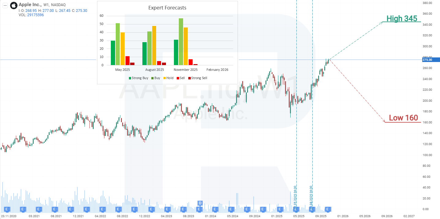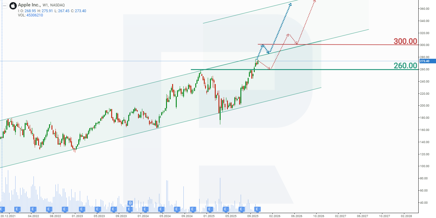 บนกรอบเวลาแบบรายสัปดาห์ (weekly timeframe) ราคาหุ้น Apple เคลื่อนไหวภายในกรอบช่องแนวโน้มขาขึ้น (upward channel) และได้แตะบริเวณด้านบนของช่อง ซึ่งทำหน้าที่เป็นแนวต้าน การเดินทางเยือนทำเนียบขาวของ Tim Cook ในเดือนสิงหาคม 2025 ส่งผลเชิงบวกต่อทั้งราคาหุ้น AAPL และผลประกอบการของบริษัท จากปัจจัยดังกล่าว ราคาหุ้น AAPL ปรับตัวขึ้นราว 35% ระหว่างเดือนสิงหาคมถึงพฤศจิกายน โดยแทบไม่เกิดการย่อตัวหรือพักฐานที่มีนัยสำคัญ ไตรมาสที่ทำสถิติสูงสุด แนวโน้มเชิงบวกสำหรับงวดถัดไป และการเปิดตัวผลิตภัณฑ์ใหม่ก่อนฤดูกาลจับจ่ายปลายปี ล้วนสร้างเงื่อนไขเอื้อต่อการปรับตัวขึ้นต่อของหุ้น AAPL จากพฤติกรรมราคาปัจจุบันของหุ้น Apple สามารถสรุปฉากทัศน์ (scenario) ที่เป็นไปได้สำหรับการเคลื่อนไหวของราคาหุ้น AAPL ในปี 2025 ได้ดังนี้: