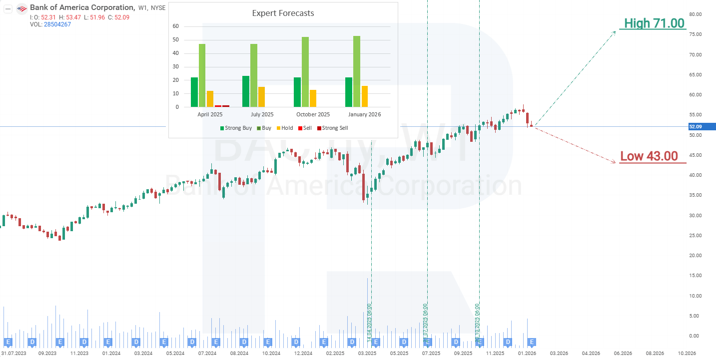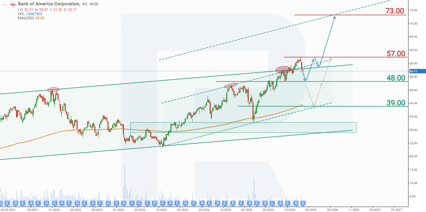 บนกราฟรายสัปดาห์ หุ้นของ Bank of America กำลังซื้อขายอยู่ในกรอบแนวโน้มขาขึ้นและได้แตะขอบบนของกรอบดังกล่าว ซึ่งทำหน้าที่เป็นแนวต้าน ความพยายามในการทะลุและยืนเหนือระดับนี้ไม่ประสบความสำเร็จ และแม้แต่รายงานผลประกอบการรายไตรมาสที่ออกมาดีกว่าคาดก็ไม่สามารถกระตุ้นการปรับตัวขึ้นได้ สิ่งนี้บ่งชี้ถึงความจำเป็นของการปรับฐานก่อนที่แนวโน้มขาขึ้นจะดำเนินต่อไป จากผลการดำเนินงานปัจจุบันของหุ้น BAC สถานการณ์ราคาที่เป็นไปได้สำหรับปี 2026 มีดังนี้: