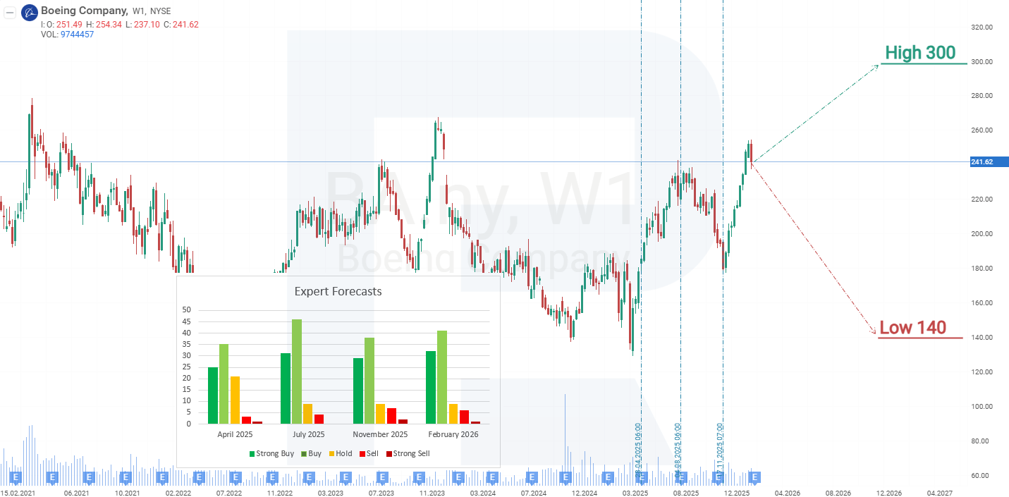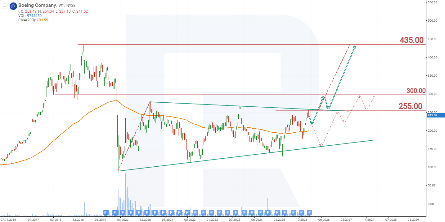 ตั้งแต่ปี 2020 ถึง 2026 กราฟหุ้น Boeing ได้ก่อตัวเป็นรูปแบบ Triangle หากมีการทะลุขึ้นเหนือขอบบน โอกาสที่ราคาจะปรับขึ้นต่อจะเพิ่มขึ้นโดยประมาณเท่ากับความสูงของรูปแบบ จากผลการดำเนินงานปัจจุบันของหุ้น Boeing สถานการณ์ราคาที่เป็นไปได้สำหรับปี 2026 มีดังนี้: