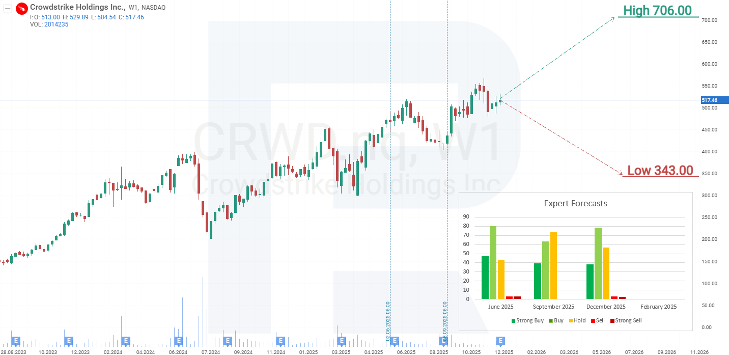 การคาดการณ์กรณีฐาน (base-case) สำหรับหุ้น CrowdStrike Holdings สมมติว่าราคาจะปรับลงจากระดับปัจจุบันไปยังแนวรับที่ 400 ดอลลาร์สหรัฐ การเด้งกลับจากระดับนี้จะเป็นสัญญาณการกลับเข้าสู่การเติบโตอีกครั้ง โดยมีเป้าหมายที่ 520 ดอลลาร์สหรัฐ ณ จุดนี้ ทิศทางถัดไปจะขึ้นอยู่กับว่าราคาสามารถทะลุแนวต้านที่ 520 ดอลลาร์สหรัฐได้หรือไม่ หากสำเร็จ หุ้นอาจปรับขึ้นกลับไปยังขอบบนของช่องใกล้ 600 ดอลลาร์สหรัฐ และทำสถิติสูงสุดใหม่อย่างต่อเนื่อง อย่างไรก็ตาม หากแนวต้านแข็งแกร่งเกินไป — ซึ่งเป็นไปได้เมื่อพิจารณาจากมูลค่าที่สูง — หุ้น CRWD อาจปรับฐานไปยังเส้นแนวโน้มใกล้ 350 ดอลลาร์สหรัฐ