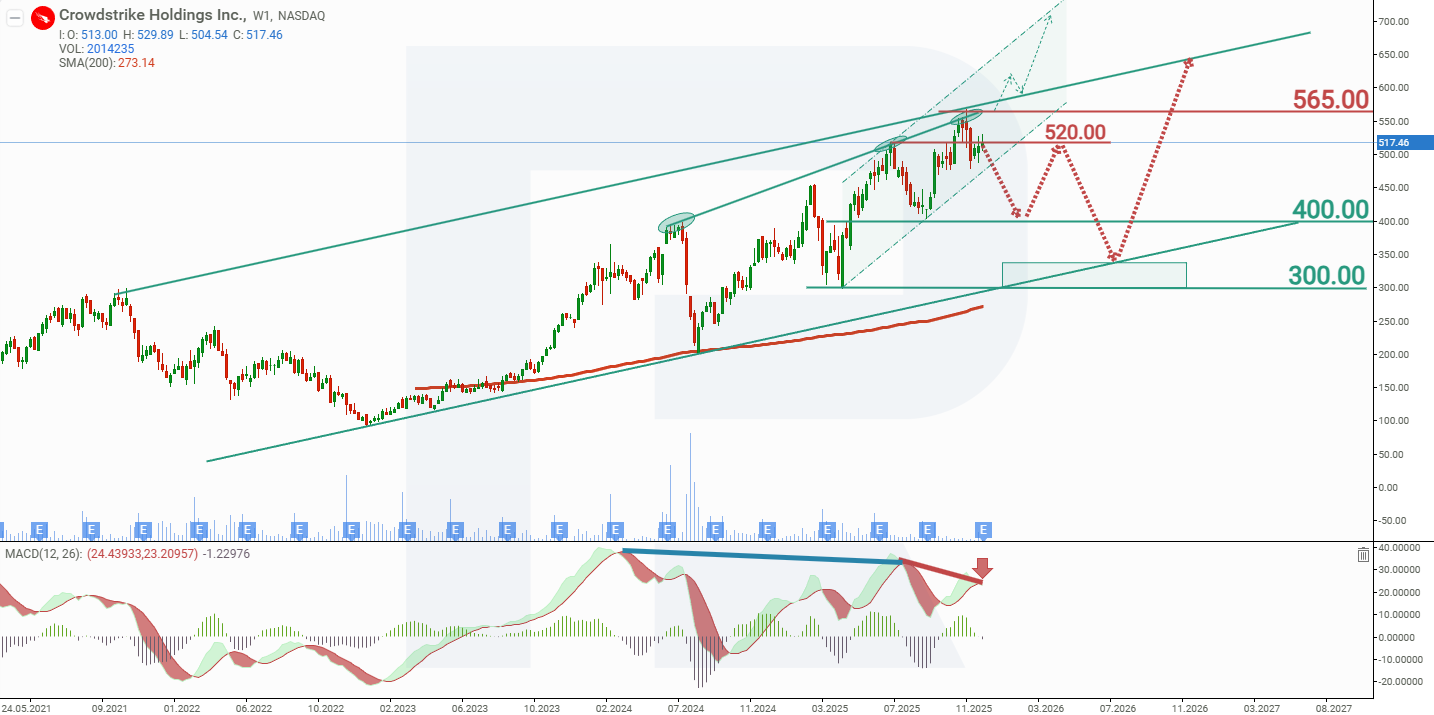 ในช่วงต้นเดือนพฤศจิกายน หุ้น CRWD ปรับฐานจากขอบบนของช่องและเริ่มปรับตัวลง แรงกดดันเพิ่มเติมต่อหุ้นถูกเสริมด้วย divergence ที่ก่อตัวบนอินดิเคเตอร์ MACD จากผลการเคลื่อนไหวของหุ้น CrowdStrike Holdings ในปัจจุบัน สถานการณ์การเคลื่อนไหวที่เป็นไปได้สำหรับปี 2026 มีดังนี้