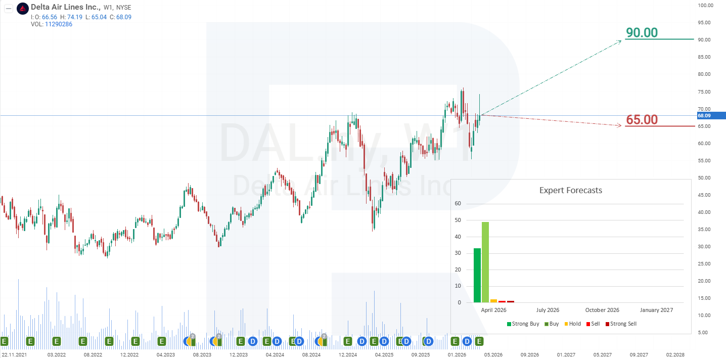 จากพลวัตราคาปัจจุบันของหุ้น Delta Air Lines สถานการณ์ที่เป็นไปได้สำหรับปี 2026 มีดังนี้: