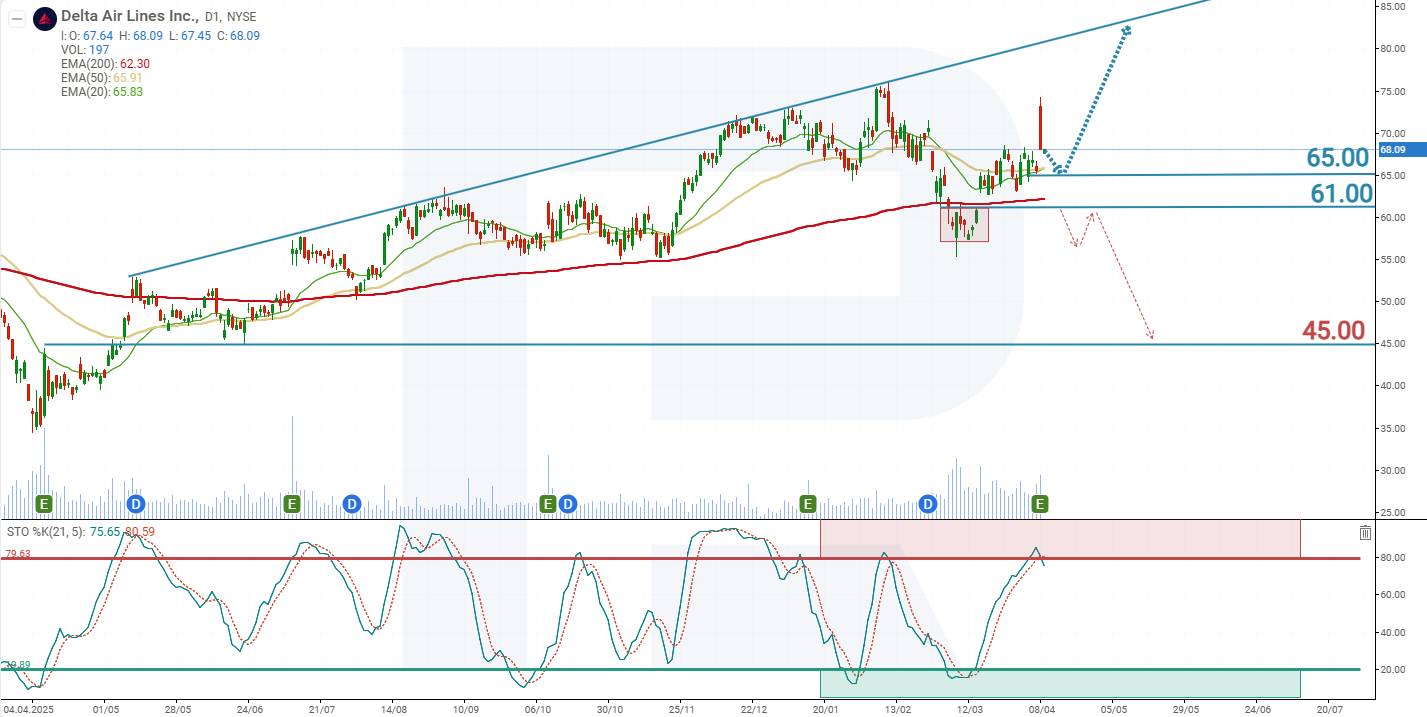 คาดการณ์ทางเลือกสำหรับหุ้น Delta Air Lines ตั้งอยู่บนสมมติฐานว่าราคาจะหลุดต่ำกว่าแนวรับที่ 61 USD ในกรณีนี้ เส้นค่าเฉลี่ยเคลื่อนที่ 200 วันจะถูกทะลุลงด้วย ซึ่งส่งสัญญาณถึงการสิ้นสุดของแนวโน้มขาขึ้น ภายใต้สถานการณ์นี้ หุ้น DAL อาจปรับตัวลงสู่แนวรับที่ 45 USD