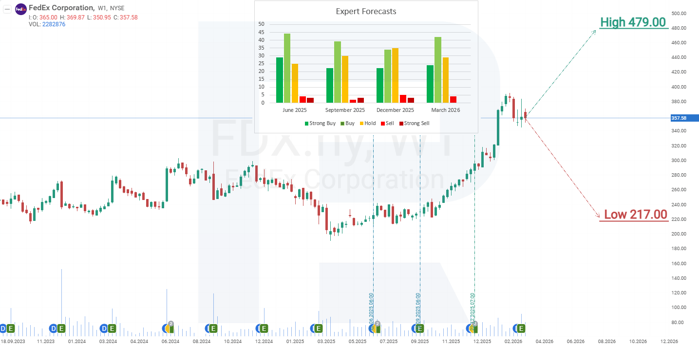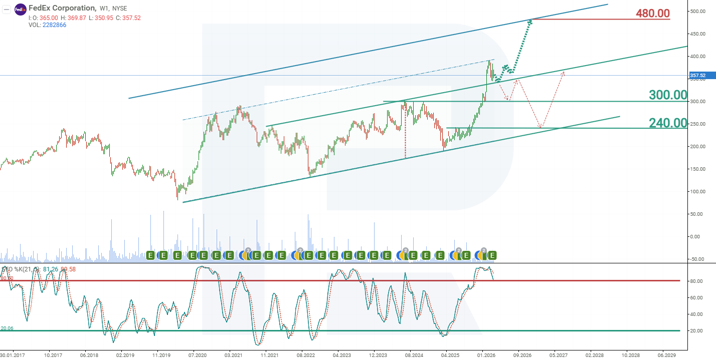 บนกราฟรายสัปดาห์ หุ้น FedEx ได้ทะลุเหนือขอบบนของ ascending channel ในเดือนกุมภาพันธ์ 2026 และยังคงยืนเหนือระดับดังกล่าว ซึ่งบ่งชี้ถึงศักยภาพในการปรับขึ้นต่อไปประมาณความกว้างของ channel – ไปจนถึงราว 480 USD อย่างไรก็ตาม ตัวชี้วัด Stochastic อยู่ในเขต overbought แล้ว ซึ่งบ่งชี้ถึงการปรับฐานระยะสั้นหรือช่วงของการเคลื่อนไหวในกรอบก่อนการขึ้นรอบถัดไป จากพลวัตราคาปัจจุบันของหุ้น FedEx สถานการณ์ที่เป็นไปได้สำหรับปี 2026 มีดังนี้: