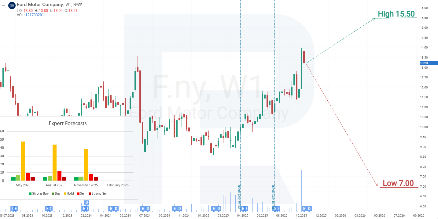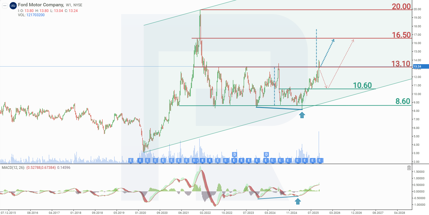 ในกรอบเวลาแบบรายสัปดาห์ หุ้นของฟอร์ดมีการซื้อขายอยู่ระหว่าง 8.60 ถึง 13.10 ดอลลาร์นับตั้งแต่ปี 2022 ในเดือนเมษายน 2025 หุ้น F หลุดต่ำกว่าขอบล่างของช่วงดังกล่าวชั่วคราว ส่งผลให้เกิดสัญญาณการกลับตัวจาก MACD (MACD convergence) ซึ่งบ่งชี้ถึงโอกาสการปรับขึ้นของราคา ส่งผลให้ราคาหุ้นฟอร์ดเพิ่มขึ้น 69% ระหว่างเดือนเมษายนถึงพฤศจิกายน หลังจากการเผยแพร่รายงานรายไตรมาส ความต้องการของนักลงทุนต่อหุ้นฟอร์ดยังคงแข็งแกร่ง เพิ่มความเป็นไปได้ของการเติบโตต่อเนื่องของราคา