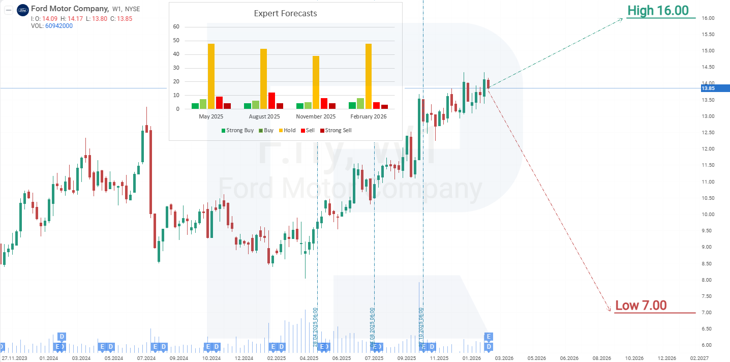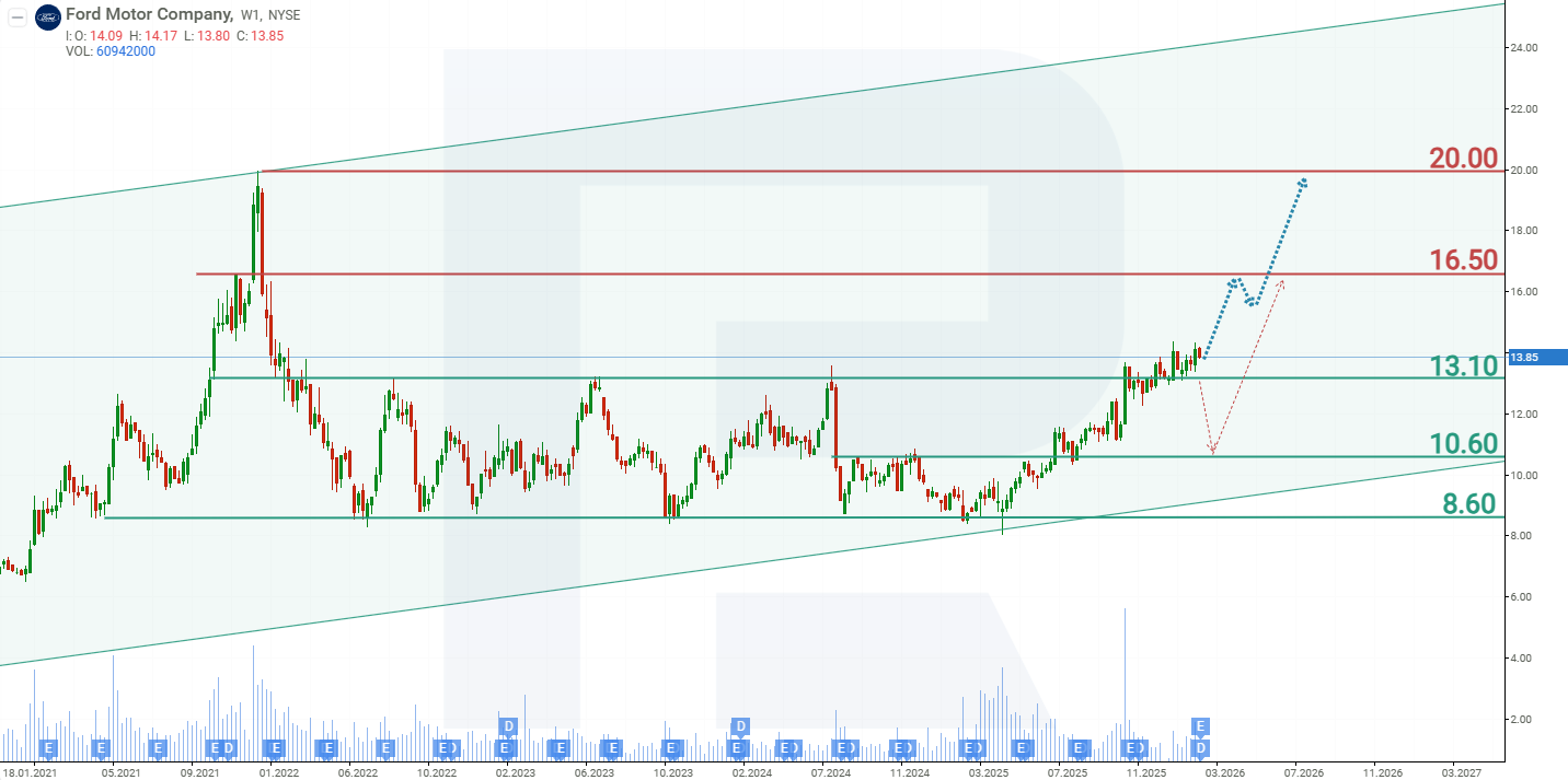 บนกราฟรายสัปดาห์ หุ้น Ford ซื้อขายอยู่ระหว่าง 8.60 และ 13.10 ดอลลาร์สหรัฐตั้งแต่ปี 2022 เป็นต้นมา ในเดือนตุลาคม 2025 F ทะลุกรอบบนของช่วงและทรงตัวเหนือระดับนั้น เพิ่มความเป็นไปได้ของการปรับขึ้นต่อไป จากผลการดำเนินงานปัจจุบันของหุ้น Ford Motor Company สถานการณ์ที่เป็นไปได้สำหรับปี 2026 มีดังนี้: