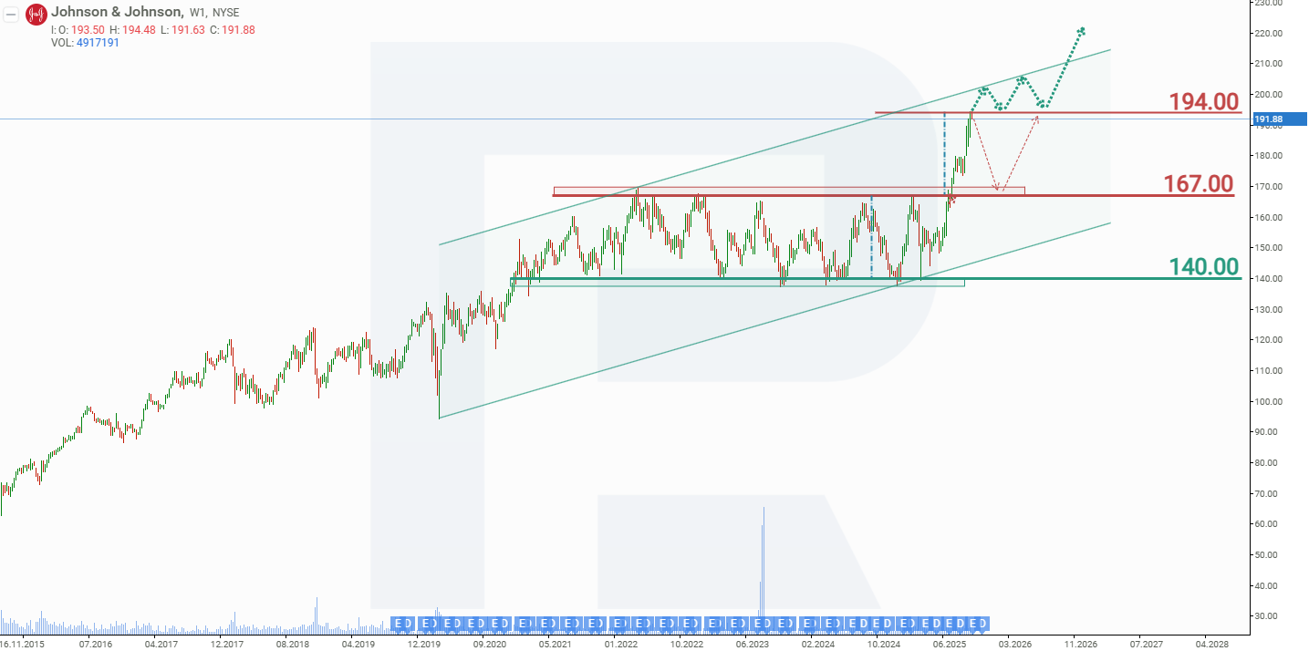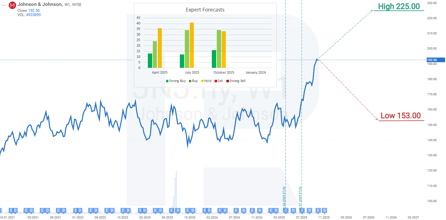 การคาดการณ์จากผู้เชี่ยวชาญเกี่ยวกับหุ้น Johnson & Johnson สำหรับปี 2025หลังการเปิดเผยรายงานไตรมาส 2 ปี 2025 หุ้น Johnson & Johnson ทะลุแนวต้านที่ 167 ดอลลาร์สหรัฐ ออกจากกรอบสะสม 140–167 ดอลลาร์สหรัฐ ที่ซื้อขายมาตั้งแต่ปี 2021 ตามประวัติ เมื่อราคาทะลุออกจากกรอบดังกล่าว การปรับขึ้นถัดมามักมีขนาดใกล้เคียงกับความกว้างของกรอบเดิม สำหรับ Johnson & Johnson ความกว้างราว 27 ดอลลาร์สหรัฐ จึงตั้งเป้าบริเวณ 194 ดอลลาร์สหรัฐหลังเบรกเอาท์ — ซึ่งหุ้นแตะระดับดังกล่าวในวันที่ประกาศผลไตรมาส 3 ปี 2025