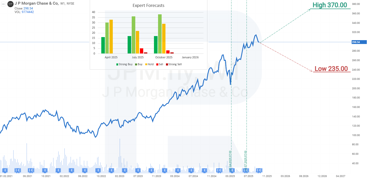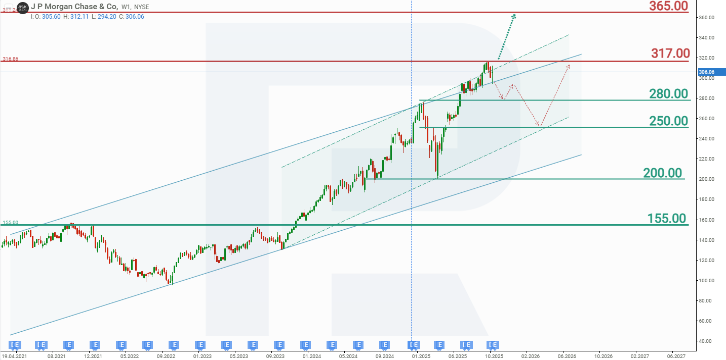 บนกราฟรายสัปดาห์ หุ้นของ JPMorgan อยู่ในแนวโน้มขาขึ้นและได้ทะลุขึ้นเหนือเส้นขอบบนของช่องทางขาขึ้น ซึ่งก่อนหน้านี้ทำหน้าที่เป็นแนวต้าน ในกรณีที่คล้ายกัน การทะลุลักษณะนี้มักเป็นสัญญาณถึงความเป็นไปได้ของการปรับตัวขึ้นต่อไป โดยอิงจากประสิทธิภาพปัจจุบันของหุ้น JPMorgan Chase & Co. สถานการณ์ที่เป็นไปได้สำหรับการเคลื่อนไหวของหุ้น JPM ในปี 2025 มีดังนี้: