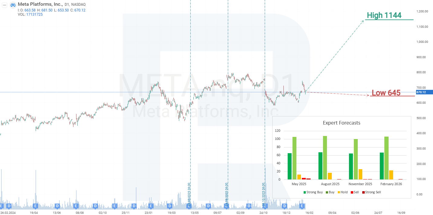 กรณีทางเลือก (alternative) สำหรับหุ้น Meta Platforms ชี้ว่าราคาอาจหลุดแนวรับ 670 ดอลลาร์สหรัฐ ในสถานการณ์นี้ หุ้น META อาจปรับลงสู่ 580 ดอลลาร์สหรัฐ จากนั้นคาดว่าจะค่อย ๆ ฟื้นตัว เนื่องจากเส้นแนวโน้มขาขึ้นจะถูกทำลาย โอกาสขาขึ้นต่อไปอาจจำกัดอยู่ที่แนวต้านบริเวณ 785 ดอลลาร์สหรัฐ