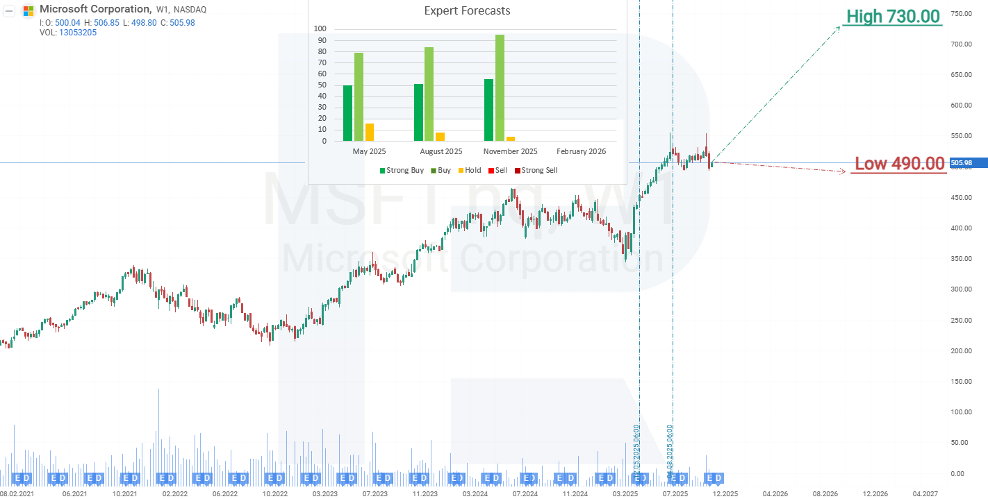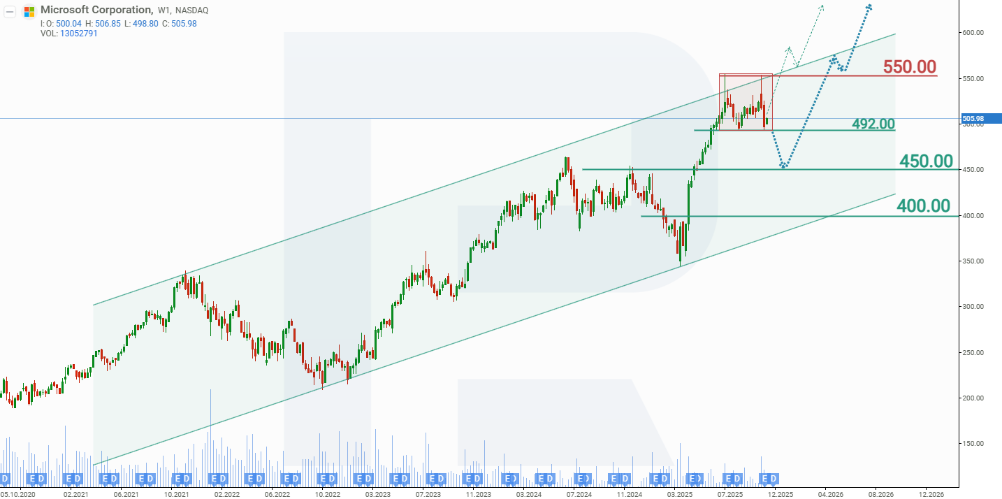 หุ้น MSFT อาจฟื้นตัวขึ้นจากระดับปัจจุบัน โดยมองว่าการปรับฐานหลังรายงานผลประกอบการได้เสร็จสิ้นแล้ว เป้าหมายแรกของการปรับตัวขึ้นคือแนวต้านที่ 550 ดอลลาร์สหรัฐ หากราคาทะลุระดับนี้ได้ จะสะท้อนความเชื่อมั่นของนักลงทุนที่เพิ่มขึ้น ซึ่งอาจทำให้ความผันผวนสูงขึ้นและผลักดันราคาไปสู่ 700 ดอลลาร์สหรัฐ ได้อย่างค่อนข้างง่าย