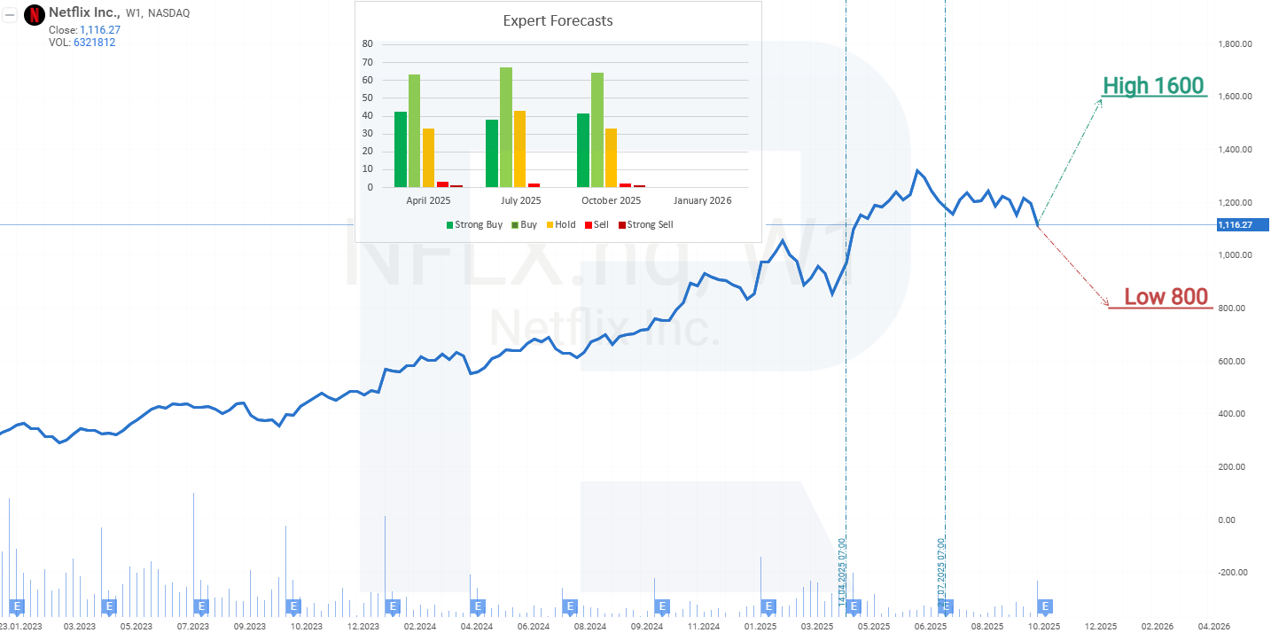 การคาดการณ์พื้นฐาน (base-case forecast) สำหรับหุ้น NFLX ชี้ว่าราคาจะทดสอบแนวรับบริเวณ 1,000 ดอลลาร์ ซึ่งบ่งบอกถึงการปรับตัวลงเพิ่มเติมประมาณ 10% คาดว่าราคาจะฟื้นตัวจากระดับนี้ โดยอาจกลับขึ้นไปทดสอบจุดสูงสุดเดิมที่ประมาณ 1,340 ดอลลาร์อีกครั้ง Netflix ยังคงมีความมั่นคงทางการเงิน และโครงการซื้อหุ้นคืนมูลค่า 10,000 ล้านดอลลาร์ของบริษัทสามารถช่วยพยุงราคาหุ้นในช่วงตลาดอ่อนตัวได้ มองไปข้างหน้า มีความเป็นไปได้ว่าบริษัทอาจเริ่มจ่ายเงินปันผลเพื่อดึงดูดนักลงทุนเพิ่มเติม ซึ่งจะเป็นปัจจัยบวกต่อการเติบโตของราคาหุ้น