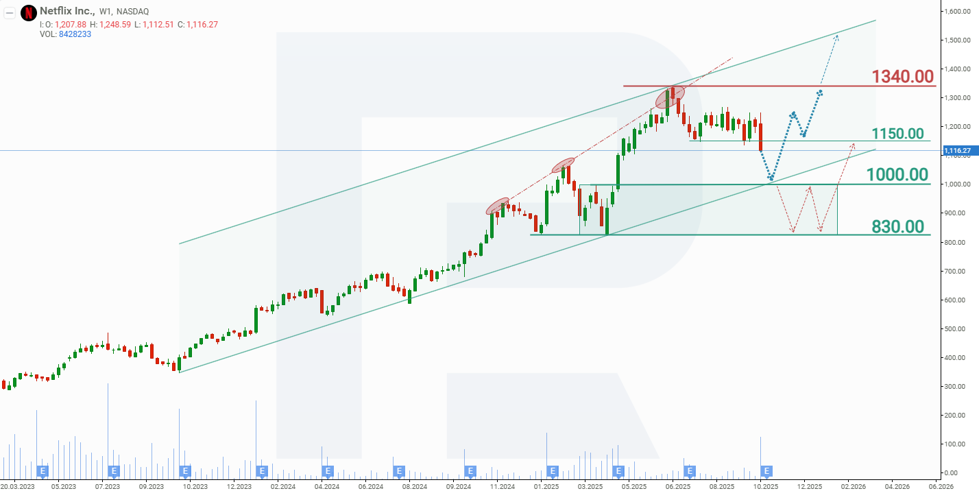 ในเดือนมิถุนายน 2025 หุ้น NFLX แตะระดับแนวต้านที่ 1,340 ดอลลาร์ ก่อนที่จะปรับตัวลง การเปิดเผยรายงานไตรมาส 2 ปี 2025 ทำให้การปรับตัวลดลงชะลอตัวชั่วคราว แต่การประกาศผลประกอบการไตรมาส 3 กลับเป็นปัจจัยเร่งให้ราคาทะลุแนวรับที่ 1,150 ดอลลาร์ และเร่งการขายออก การเคลื่อนไหวขาลงนี้เกิดจากแนวโน้มประมาณการอัตรากำไรจากการดำเนินงานของบริษัทที่ลดลงเป็นหลัก โดยอิงจากพฤติกรรมราคาปัจจุบัน สามารถระบุหลายสถานการณ์ที่เป็นไปได้สำหรับการเคลื่อนไหวของหุ้น NFLX ในปี 2025