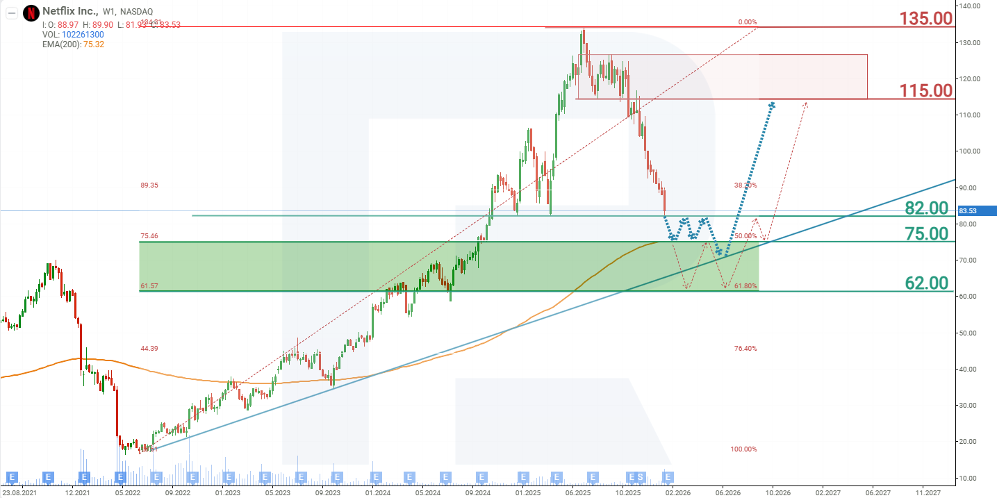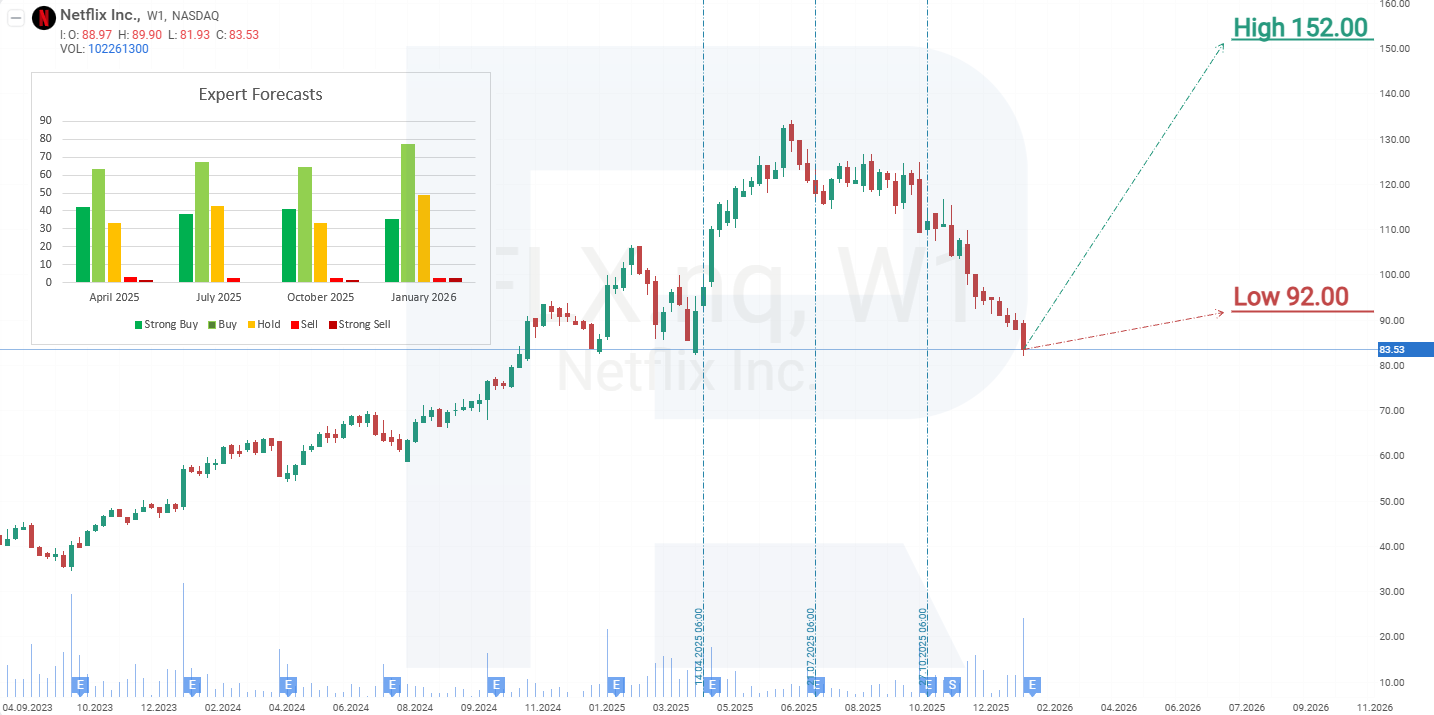 ในเดือนมิถุนายน 2025 หุ้น NFLX ทำสถิติสูงสุดตลอดกาลที่ระดับ 134 USD หลังจากนั้นราคาหุ้นเริ่มปรับตัวลดลง การเผยแพร่รายงานไตรมาส 2 ปี 2025 ชะลอการปรับตัวลงชั่วคราว แต่รายงานไตรมาส 3 กลับทำหน้าที่เป็นตัวเร่ง ทำให้ราคาหลุดระดับแนวรับที่ 115 USD และเร่งการปรับตัวลงของราคาหุ้น สาเหตุของปฏิกิริยาของนักลงทุนคือการที่บริษัทปรับลดการคาดการณ์อัตรากำไรจากการดำเนินงาน แรงกดดันต่อหุ้น Netflix ยังคงไม่คลี่คลาย ในเดือนธันวาคม 2025 มีการเปิดเผยว่าบริษัทมีแผนเข้าซื้อ Warner Bros. Discovery Inc. ซึ่งบ่งชี้ถึงภาระทางการเงินที่เพิ่มขึ้น ส่งผลให้หุ้น NFLX ลดลงถึง 40% จากเดือนมิถุนายน 2025 ถึงมกราคม 2026 ข้อมูลใหม่ที่ระบุว่าดีลจะใช้เงินสดทั้งหมดอาจยังคงส่งผลเชิงลบต่อราคาหุ้นต่อไปอีกระยะหนึ่ง จากผลการดำเนินงานปัจจุบันของหุ้น NFLX สถานการณ์ราคาที่เป็นไปได้สำหรับ Netflix ในปี 2026 มีดังนี้: