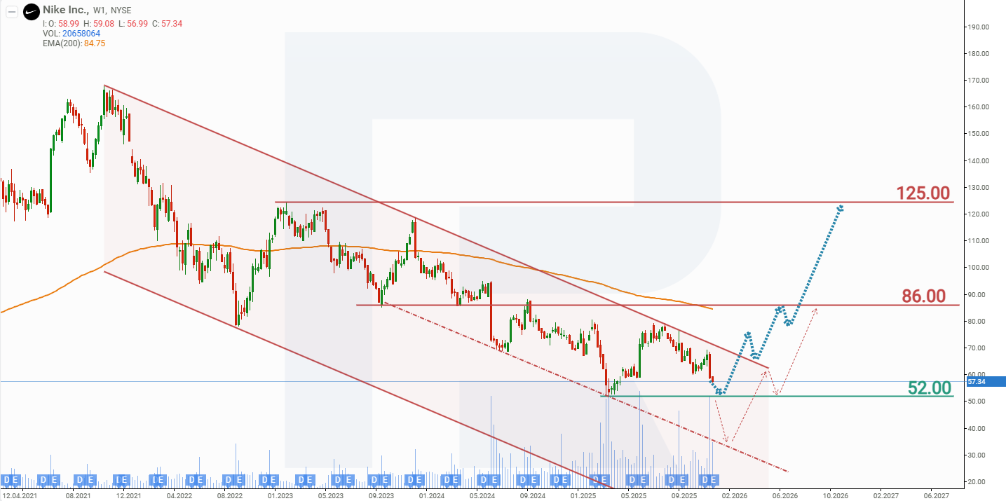 บนกรอบเวลารายสัปดาห์ตั้งแต่เดือนพฤศจิกายน 2021 หุ้น Nike ซื้อขายอยู่ภายในช่องขาลง (descending channel) ตลอดสี่ไตรมาสที่ผ่านมา กำไรของบริษัทไม่ได้แสดงการเติบโตเมื่อเทียบปีต่อปี — จริง ๆ แล้วมาร์จิ้นค่อย ๆ ลดลงต่อเนื่อง ปัจจัยเหล่านี้กำลังกดดันหุ้น ทำให้ราคา NKE กลับมาเข้าใกล้แนวรับ 52 ดอลลาร์สหรัฐอีกครั้ง ซึ่งสอดคล้องกับราคาต่ำสุดในช่วงเจ็ดปีที่ผ่านมา
