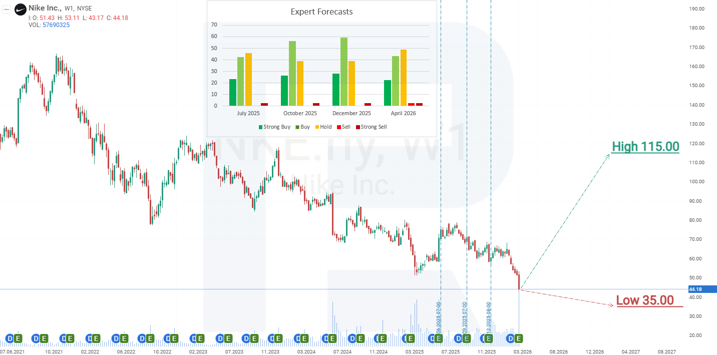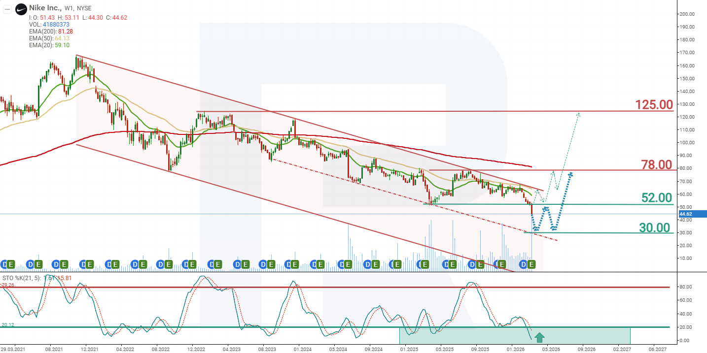 คาดการณ์ทางเลือกสำหรับหุ้น Nike ตั้งอยู่บนสมมติฐานว่าราคาจะทะลุเหนือระดับ 52 USD แรงกระตุ้นนี้อาจจุดชนวนการปรับขึ้นต่อไปสู่ 78 USD ในกรณีที่ทะลุเหนือแนวต้านนี้ได้ เป้าหมายขาขึ้นถัดไปจะอยู่ที่ 125 USD