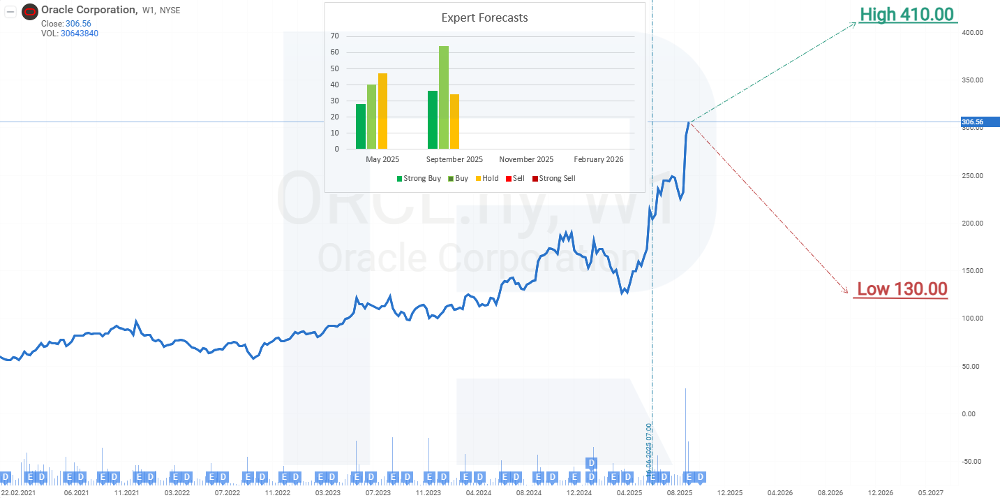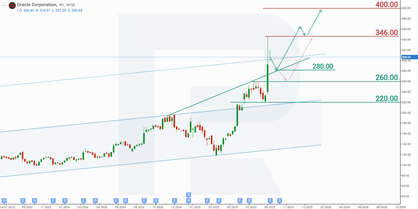 ตั้งแต่เดือนเมษายนถึงกันยายน 2025 หุ้น ORCL พุ่งขึ้น 193% ในช่วงเวลาเพียงสามสัปดาห์ที่ผ่านมา หุ้นเพิ่มขึ้น 120 ดอลลาร์สหรัฐ หรือเท่ากับการปรับขึ้น 57% จากสถานการณ์นี้ ระดับแนวต้านหลักทั้งหมดถูกทำลายลง โดยมีการบันทึกจุดสูงสุดตลอดกาลใหม่ที่ 346 ดอลลาร์สหรัฐ จากการพุ่งขึ้นอย่างรวดเร็วนี้ ความน่าจะเป็นที่จะเกิดการปรับฐานก่อนที่จะมีการกลับมาของแนวโน้มขาขึ้นมีมากขึ้น โดยอิงตามพลวัตปัจจุบันของราคาหุ้น Oracle การคาดการณ์ที่เป็นไปได้สำหรับปี 2025 มีดังนี้: