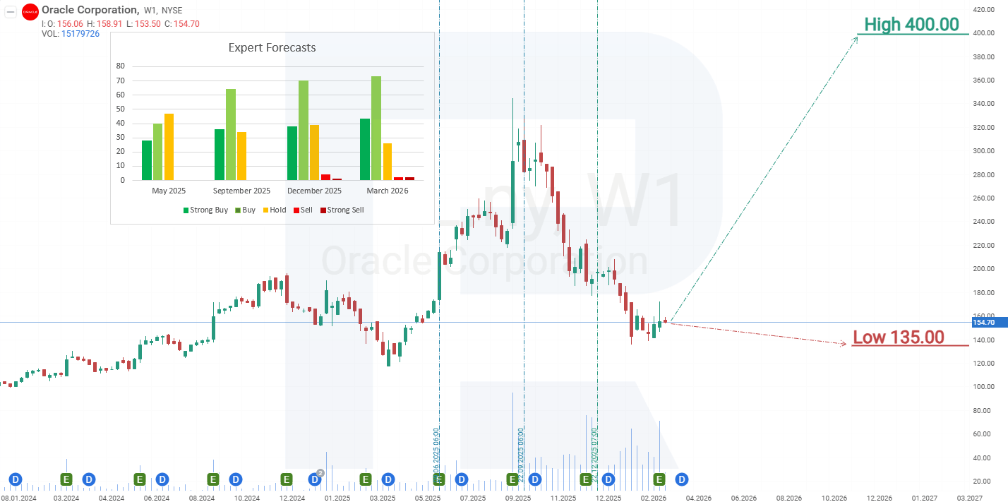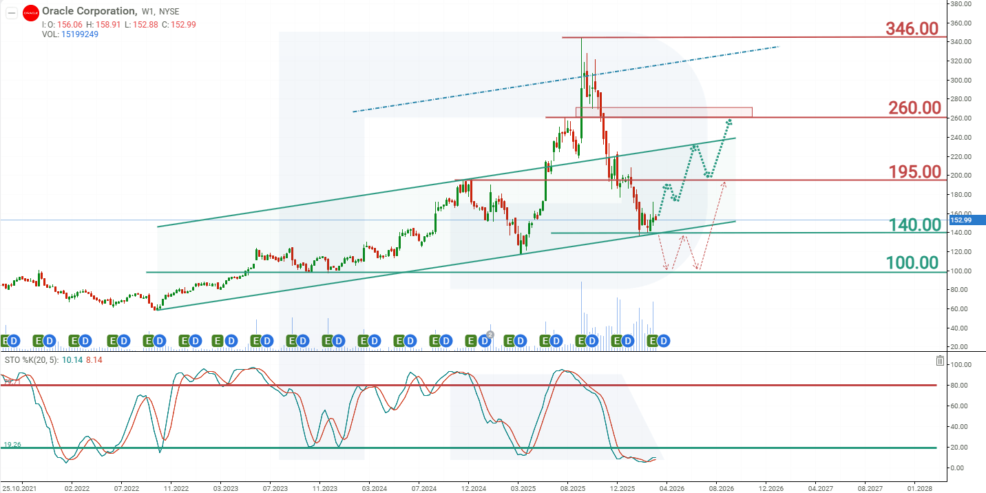 ณ เดือนมีนาคม 2026 หุ้นกำลังซื้อขายอยู่ที่เส้นแนวโน้ม ซึ่งทำหน้าที่เป็นแนวรับ ปัจจัยสนับสนุนเพิ่มเติมคืออินดิเคเตอร์ Stochastic ที่ยังอยู่ในเขต oversold จากพฤติกรรมราคาปัจจุบันของหุ้น Oracle สถานการณ์ราคาที่เป็นไปได้สำหรับปี 2026 มีดังนี้: