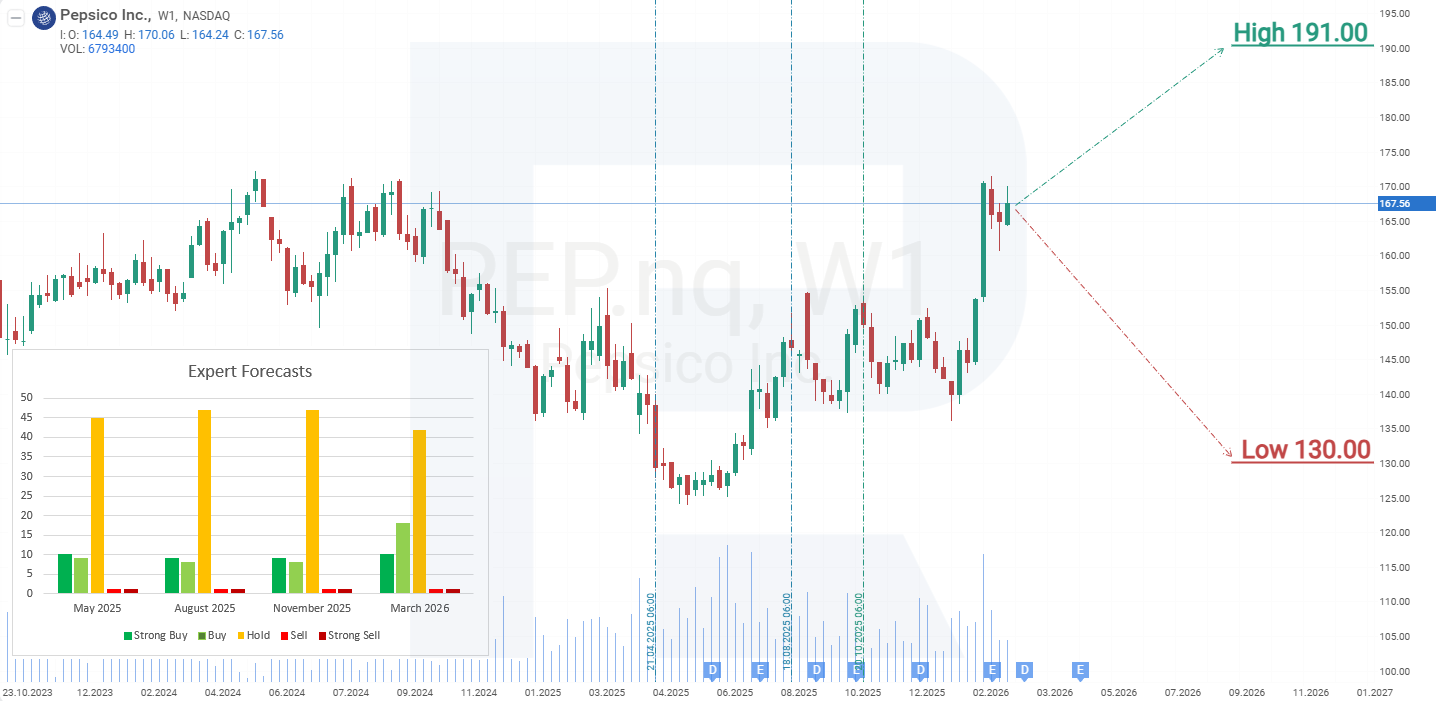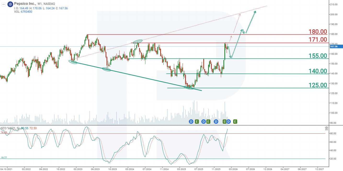บนกราฟรายสัปดาห์ หุ้น PepsiCo พบแนวต้านที่ระดับ 171 USD อย่างไรก็ตาม ตัวชี้วัด Stochastic อยู่ในโซน overbought แล้ว ซึ่งบ่งชี้ถึงความเป็นไปได้ของการปรับฐานก่อนการเคลื่อนไหวขึ้นต่อ จากผลการดำเนินงานปัจจุบันของหุ้น PepsiCo การเคลื่อนไหวของราคาที่เป็นไปได้สำหรับปี 2026 มีดังนี้: