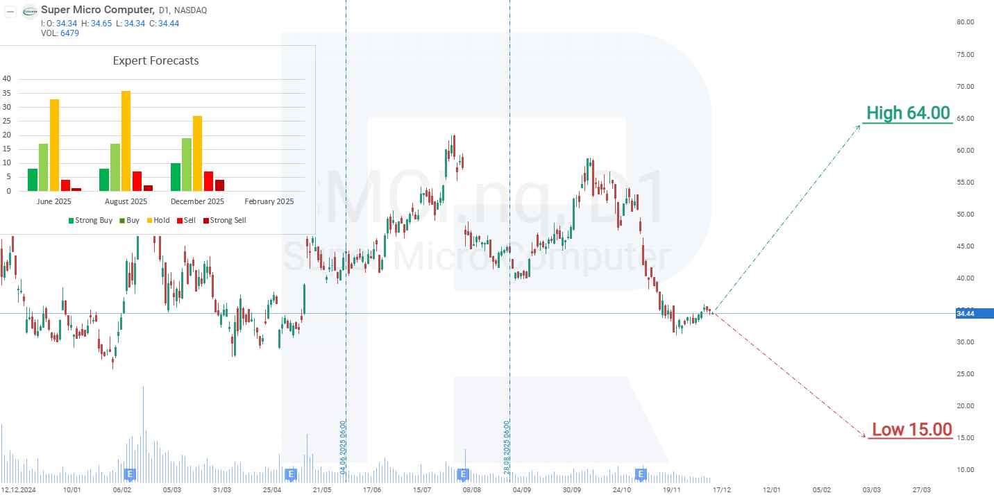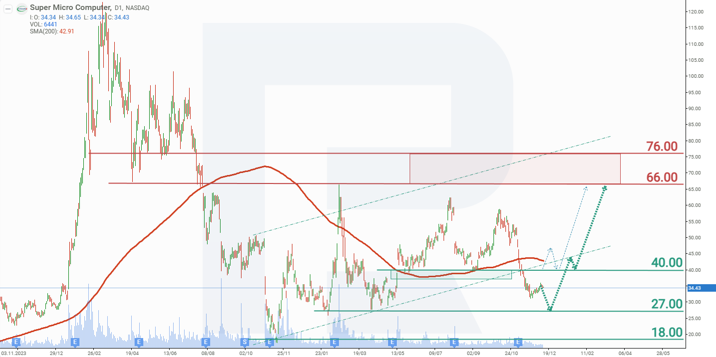 หลังจากลดลง 85% จากจุดสูงสุดตลอดกาล หุ้น Super Micro Computer ยังไม่สามารถสร้างแนวโน้มขาขึ้นที่ยั่งยืนได้ หุ้นยังคงซื้อขายอยู่ในกรอบกว้างระหว่าง 27 ดอลลาร์สหรัฐถึง 60 ดอลลาร์สหรัฐ โดยบางครั้งเคลื่อนไหวออกนอกขอบเขตเหล่านี้ หลังการเผยแพร่รายงานรายไตรมาส ไม่มีการเปลี่ยนแปลงสำคัญ – ราคาหุ้นค่อย ๆ ไหลลงไปหาแนวรับที่ 27 ดอลลาร์สหรัฐ จากผลการเคลื่อนไหวราคาหุ้นของ Super Micro Computer ในปัจจุบัน สถานการณ์ที่เป็นไปได้สำหรับปี 2026 มีดังนี้: