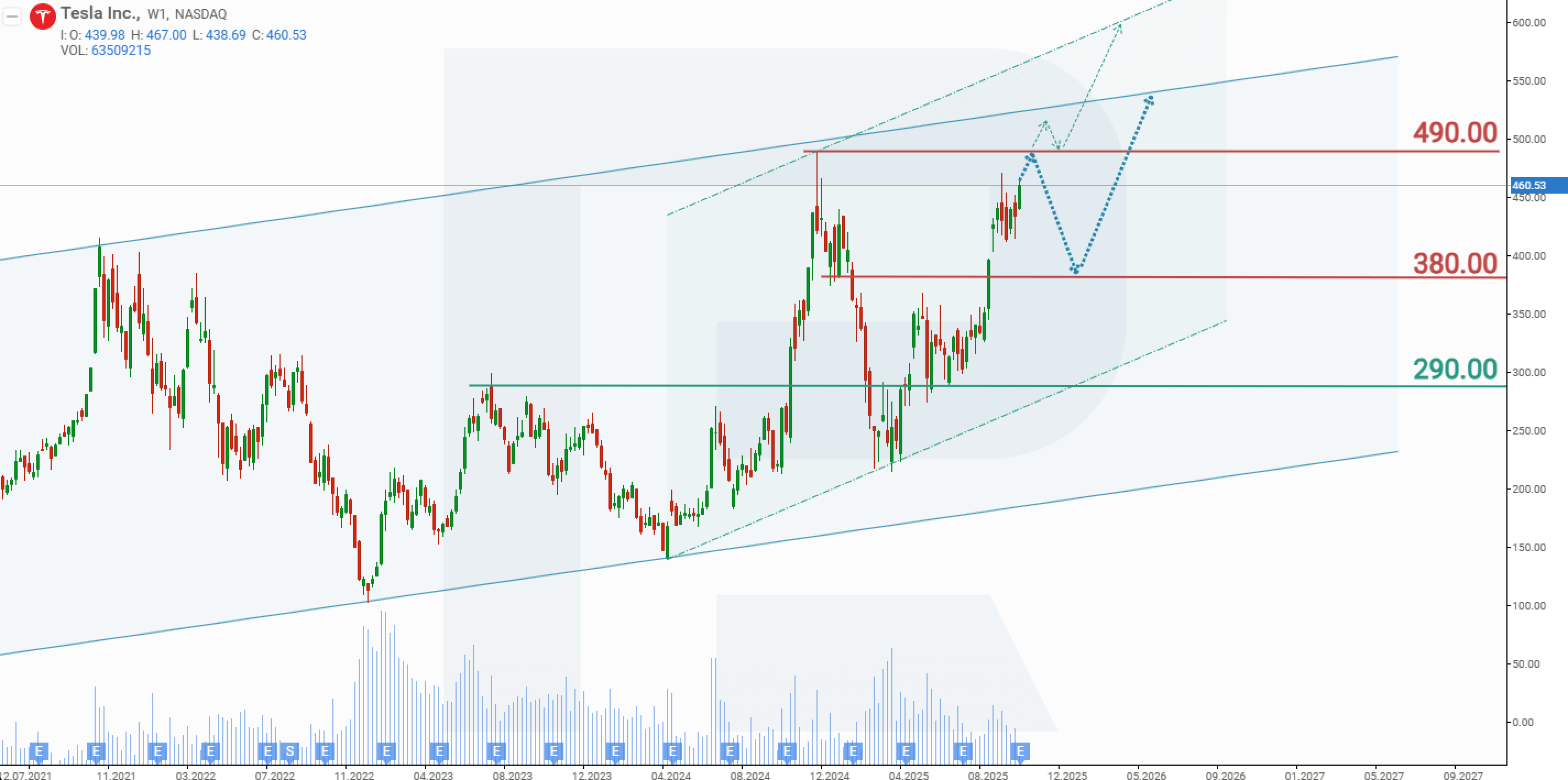 กรณีพื้นฐาน (Base-case): ราคาหุ้น Tesla อาจทดสอบแนวต้านที่ 490 ดอลลาร์สหรัฐ ก่อนจะปรับฐานลงมาที่ 380 ดอลลาร์สหรัฐ การเคลื่อนไหวดังกล่าวจะเป็นการพักฐานก่อนการขึ้นรอบใหม่ หากราคาหุ้นดีดกลับจากแนวรับที่ 380 ดอลลาร์สหรัฐ จะเป็นสัญญาณของแนวโน้มขาขึ้นอีกครั้ง โดยมีเป้าหมายบริเวณขอบบนของช่องแนวโน้มที่ประมาณ 550 ดอลลาร์สหรัฐ