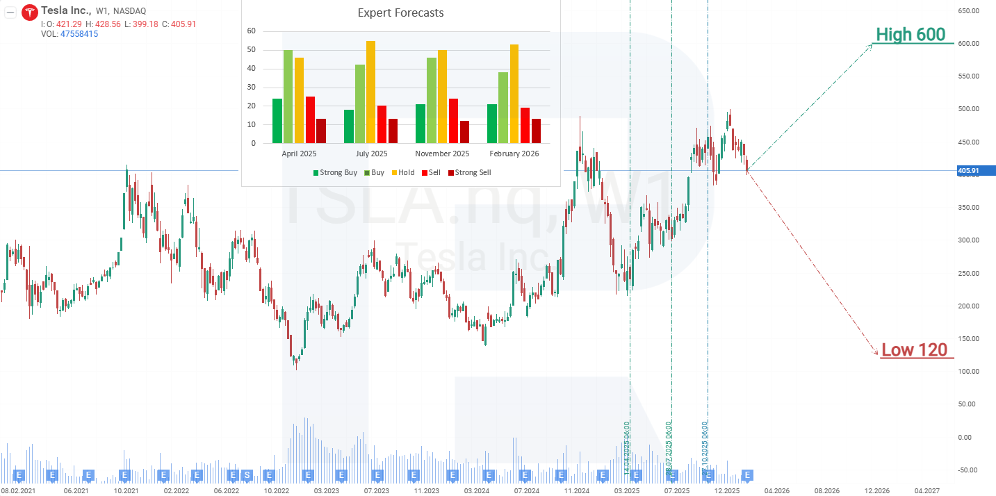 การคาดการณ์กรณีฐานสำหรับหุ้น Tesla บ่งชี้ถึงการปรับตัวลงต่อไปสู่แนวรับที่ 380 ดอลลาร์สหรัฐ ที่ระดับนี้คาดว่าการปรับฐานจะสิ้นสุดลง ตามด้วยการกลับมาของการเพิ่มขึ้นของราคาในกรอบแนวโน้มขาขึ้นที่กว้างกว่า เป้าหมายขาขึ้นแรกจะเป็นแนวต้าน 490 ดอลลาร์สหรัฐ หากทะลุระดับนี้ เป้าหมายถัดไปจะเป็นขอบบนของช่องขาขึ้นใกล้ 600 ดอลลาร์สหรัฐ