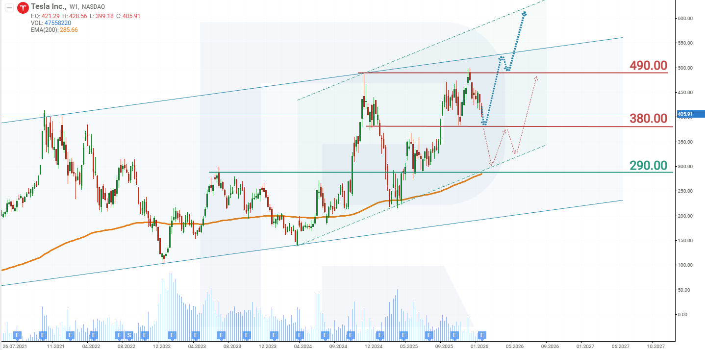 หุ้น Tesla กำลังซื้อขายอยู่ภายในช่องขาขึ้น ในเดือนธันวาคม 2025 หุ้นทำจุดสูงสุดที่ 490 ดอลลาร์สหรัฐก่อนจะปรับตัวลง การเคลื่อนไหวนี้สามารถมองเป็นการปรับฐานภายในแนวโน้มขาขึ้น
