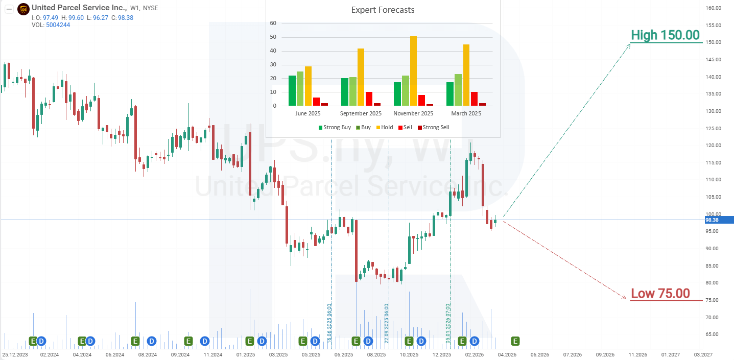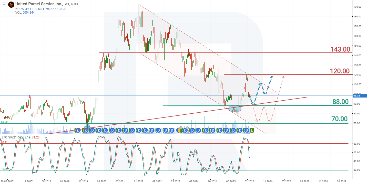 UPS ทำกำไรได้สูงกว่าที่คาดการณ์ไว้และออกแนวโน้มเชิงบวกระดับปานกลางสำหรับปี 2026 แต่หุ้นยังคงเคลื่อนไหวอยู่ในกรอบขาลง สถานการณ์พื้นฐานคาดว่าจะมีการทดสอบแนวรับที่ 88 USD โดยมีโอกาสดีดตัวกลับขึ้นไปยัง 120 USD