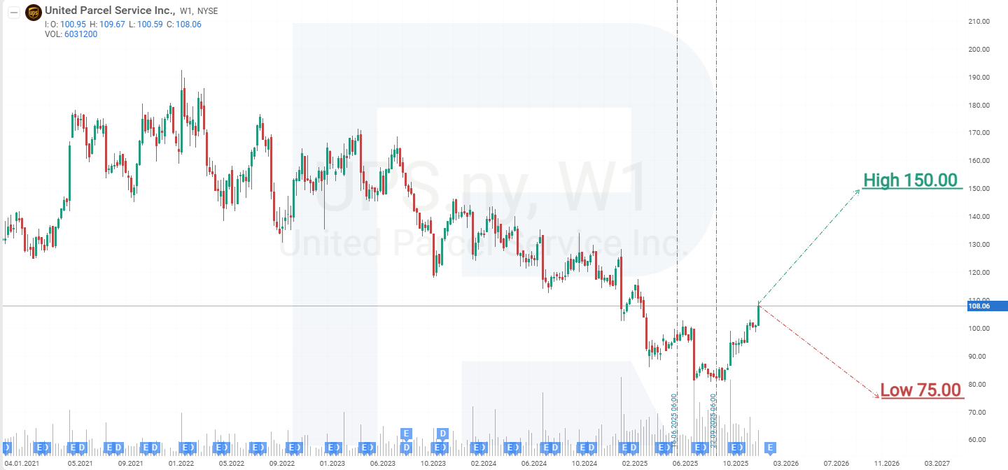 ในเดือนกรกฎาคม 2025 หุ้น United Parcel Service ทำจุดต่ำสุดที่ 80 USD ลดลง 58% จากจุดสูงสุดที่ 192 USD ซึ่งบันทึกไว้ในเดือนมกราคม 2022 หลังจากช่วงการสะสมตัวระยะสั้น หุ้น UPS ทะลุแนวต้าน 88 USD ในเดือนตุลาคม 2025 และปรับตัวสูงขึ้น โดยเพิ่มขึ้นราว 33% นักลงทุนระยะสั้นบางส่วนที่สะสมหุ้นระหว่างช่วงสะสมตัวมีแนวโน้มเริ่มล็อกกำไร ซึ่งอาจนำไปสู่การย่อตัวของราคา จากผลการดำเนินงานปัจจุบันของหุ้น UPS สถานการณ์ราคาที่เป็นไปได้สำหรับ UPS ในปี 2026 ถูกสรุปไว้ด้านล่าง