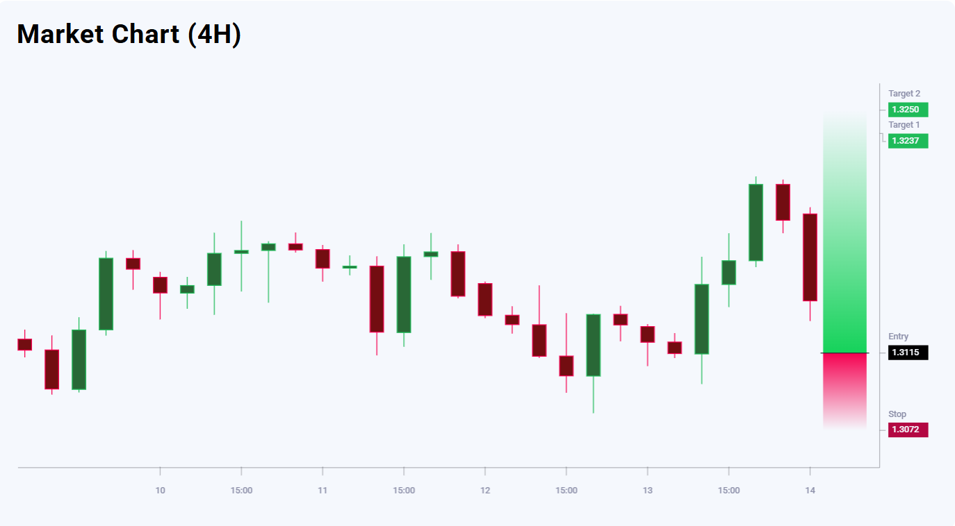 มุมมองของตลาดต่อ GBPUSD แสดงอคติขาลง – 69% เทียบกับ 31% อัตราส่วนความเสี่ยงต่อผลตอบแทนมากกว่า 1:3 กำไรที่เป็นไปได้คือ 122 จุดสำหรับเป้าหมายแรก และ 135 จุดสำหรับเป้าหมายที่สอง ขณะที่การขาดทุนจำกัดไว้ที่ 43 จุด