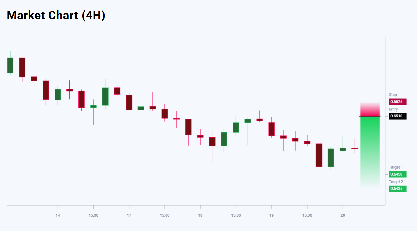 มุมมองของตลาดต่อ AUDUSD แสดงอคติขาลง – 60% เทียบกับ 40% อัตราส่วนความเสี่ยงต่อผลตอบแทนอยู่ที่ 1:5 กำไรที่เป็นไปได้คือ 60 จุดสำหรับเป้าหมายแรก และ 75 จุดสำหรับเป้าหมายที่สอง โดยขาดทุนจำกัดไว้ที่ 15 จุด
