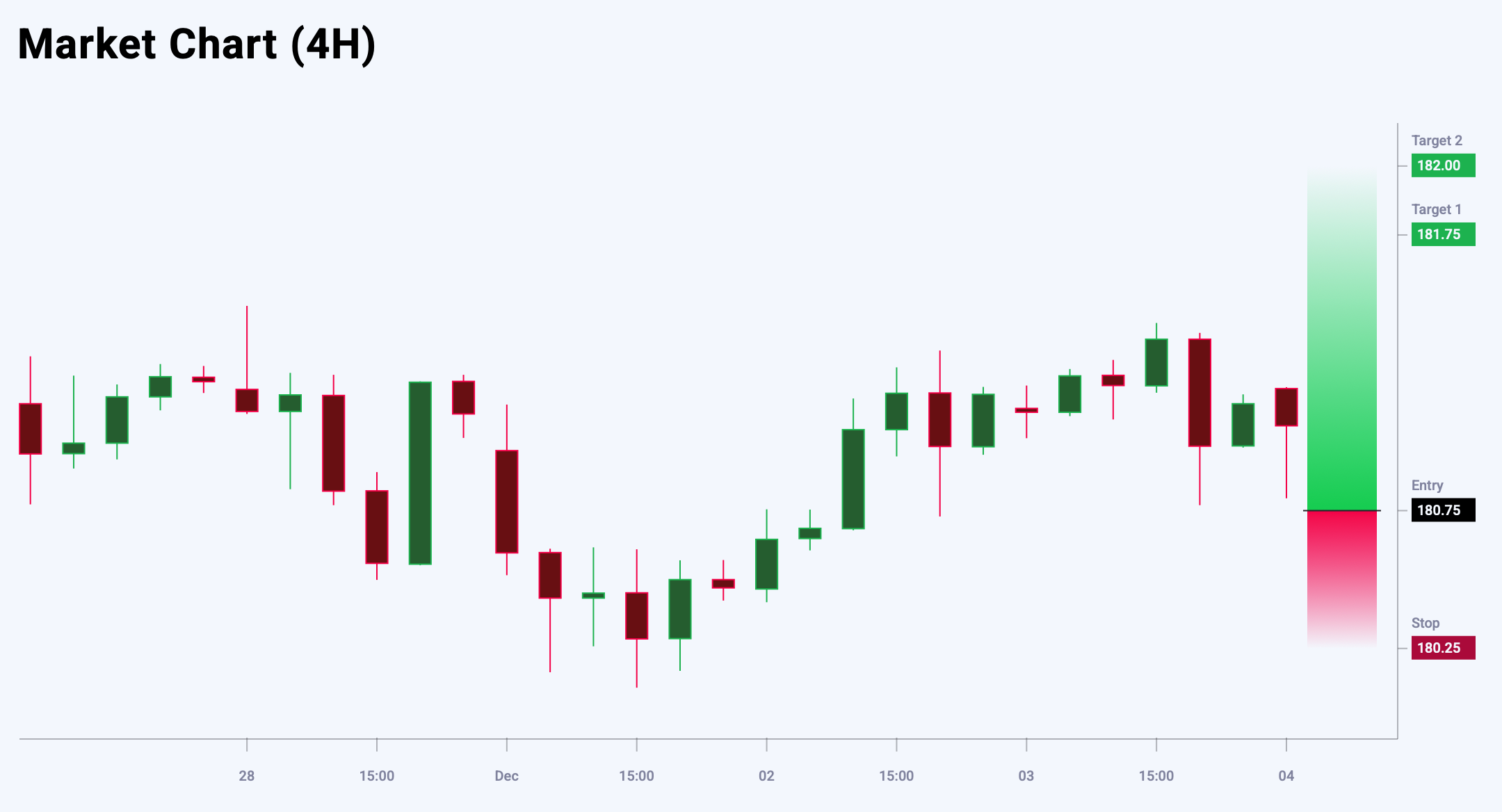 ขณะนี้ยังไม่พบสัญญาณชัดเจนว่าระดับแนวโน้มขาขึ้นของ EURJPY กำลังสิ้นสุดลง แม้ว่าอารมณ์ตลาดยังคงเป็นขาขึ้น แต่มีโอกาสเกิดการปรับฐานลงระยะสั้นโดยที่โครงสร้างขาขึ้นระยะใหญ่ยังไม่ถูกคุกคาม อัตราส่วนความเสี่ยงต่อผลตอบแทนสำหรับการซื้อจากระดับปัจจุบันยังไม่น่าสนใจ จึงไม่แนะนำให้เปิดสถานะซื้อในตอนนี้ การทะลุเหนือ 181.25 จะยืนยันโมเมนตัมขาขึ้น เป้าหมายอยู่ที่ 182.00 วันนี้แนะนำให้ตั้งคำสั่ง Buy Limit
