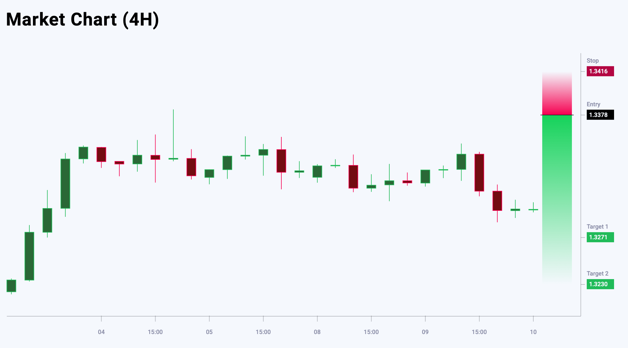 มุมมองตลาดต่อ GBPUSD แสดงอคติขาขึ้น – 74% เทียบกับ 26% อัตราส่วนความเสี่ยงต่อผลตอบแทนมากกว่า 1:3 กำไรที่เป็นไปได้ 107 จุดที่เป้าหมายแรก และ 148 จุดที่เป้าหมายที่สอง โดยขาดทุนจำกัดที่ 38 จุด