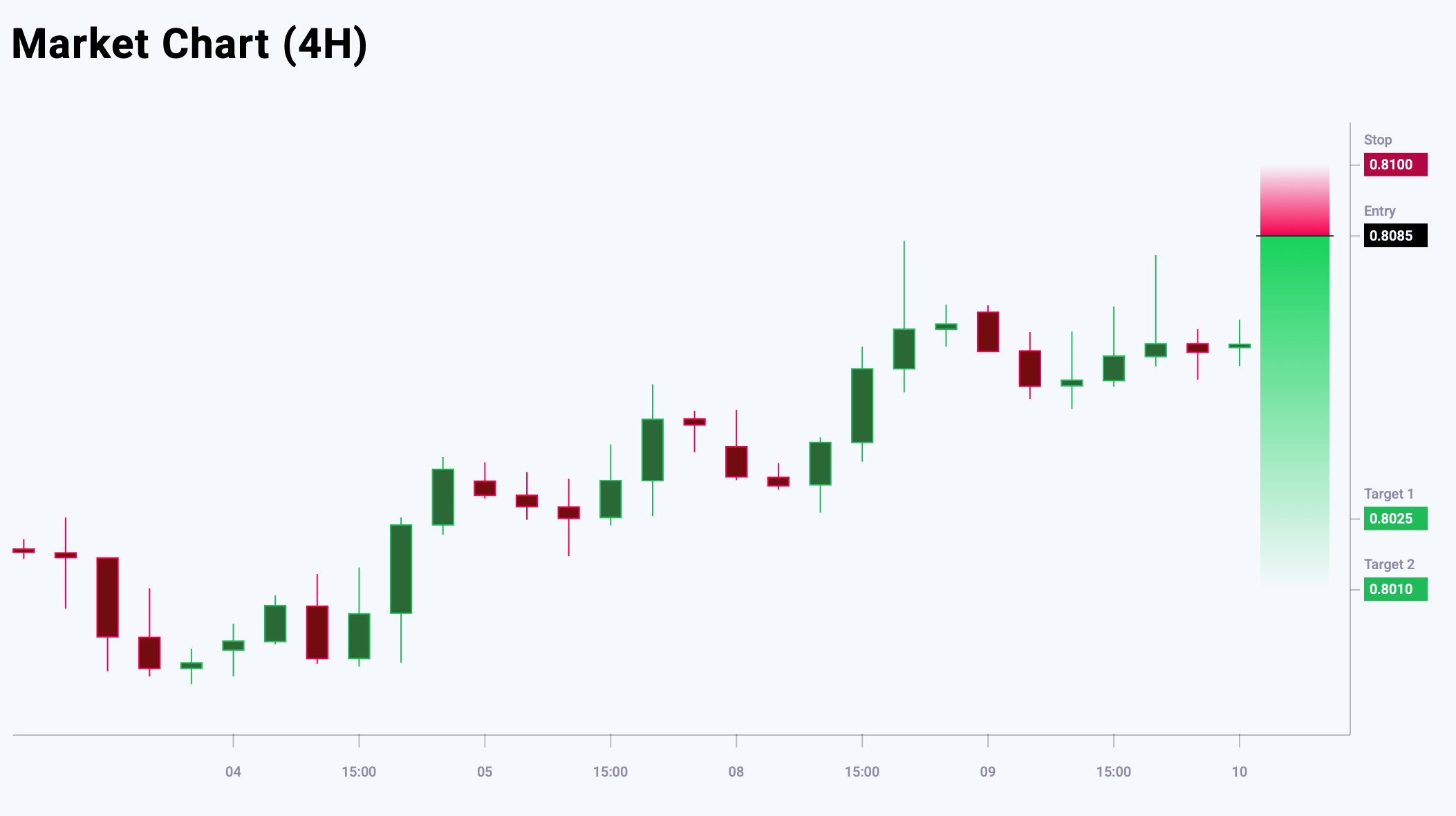 กราฟ USDCHF แสดงการเคลื่อนไหวที่ผันผวน โดยมีสัญญาณของการก่อตัวเป็นยอดระยะสั้น ระดับแนวต้านสำคัญอยู่ที่ 0.8085 การเปิดสถานะขายที่ระดับปัจจุบันมีอัตราส่วนความเสี่ยงต่อผลตอบแทนที่ไม่เอื้ออำนวย กลยุทธ์ที่เหมาะสมคือรอให้ราคาเด้งขึ้นสู่แนวต้านแล้วค่อยเปิดสถานะขาย วันนี้แนวคิดการเทรด USDCHF แนะนำให้ตั้งคำสั่ง Sell Limit