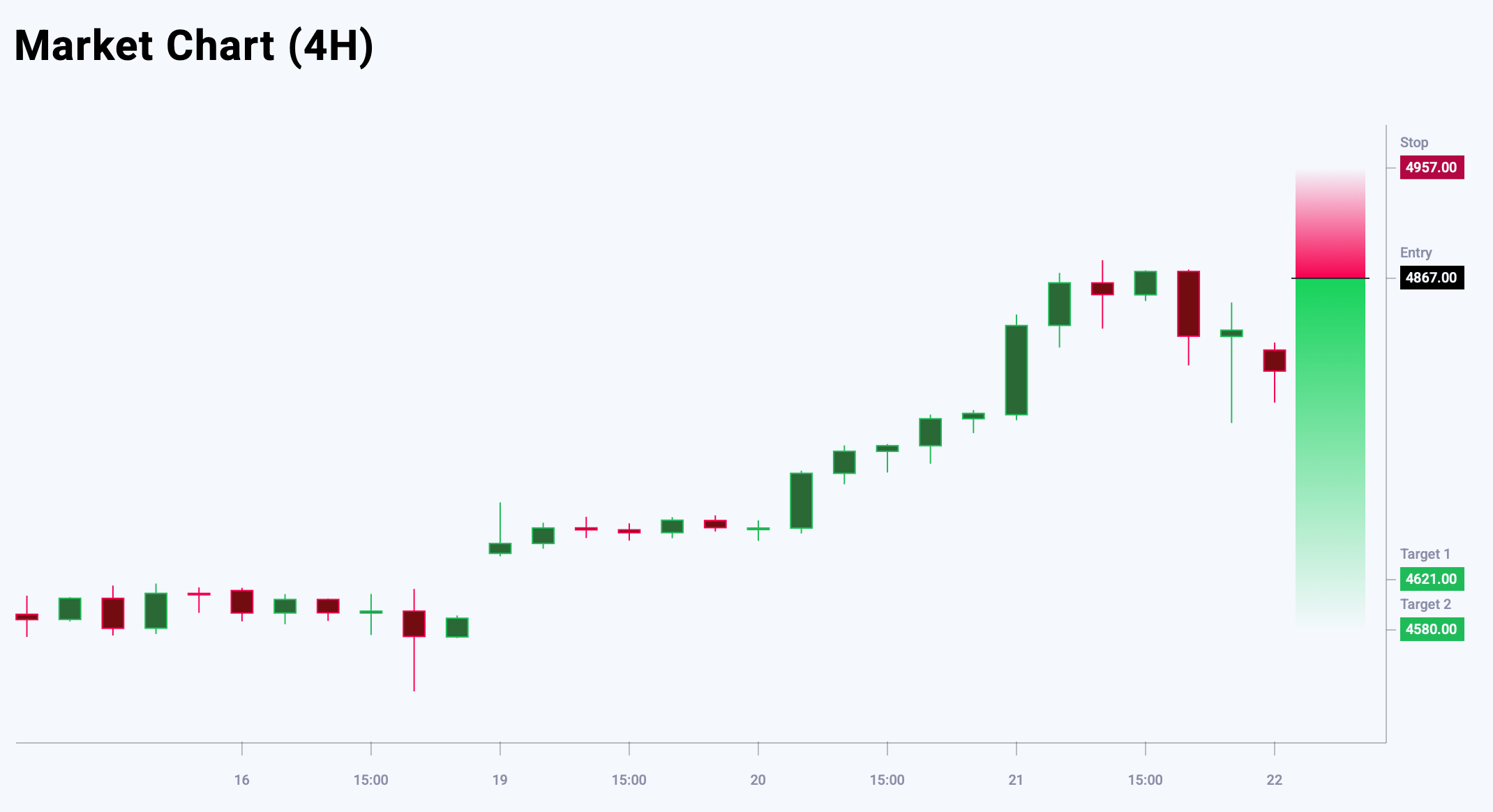 การปรับตัวขึ้นของ XAUUSD จากระดับ 4,536 ดอลลาร์สหรัฐ ส่งผลให้ราคาปรับตัวเพิ่มขึ้นในกราฟรายวันเมื่อวานนี้ โดยมีแรงซื้อปรากฏในช่วงตลาดเอเชีย ราคาปรับตัวขึ้นไปทำจุดสูงสุดใหม่ตลอดกาลที่ระดับ 4,888 ดอลลาร์สหรัฐ การปรับฐานในช่วงกลางคืนถูกแรงซื้อดูดซับอย่างรวดเร็ว ส่งผลให้มีโอกาสเกิดแรงซื้อเพิ่มเติมในช่วงเช้าของวันนี้