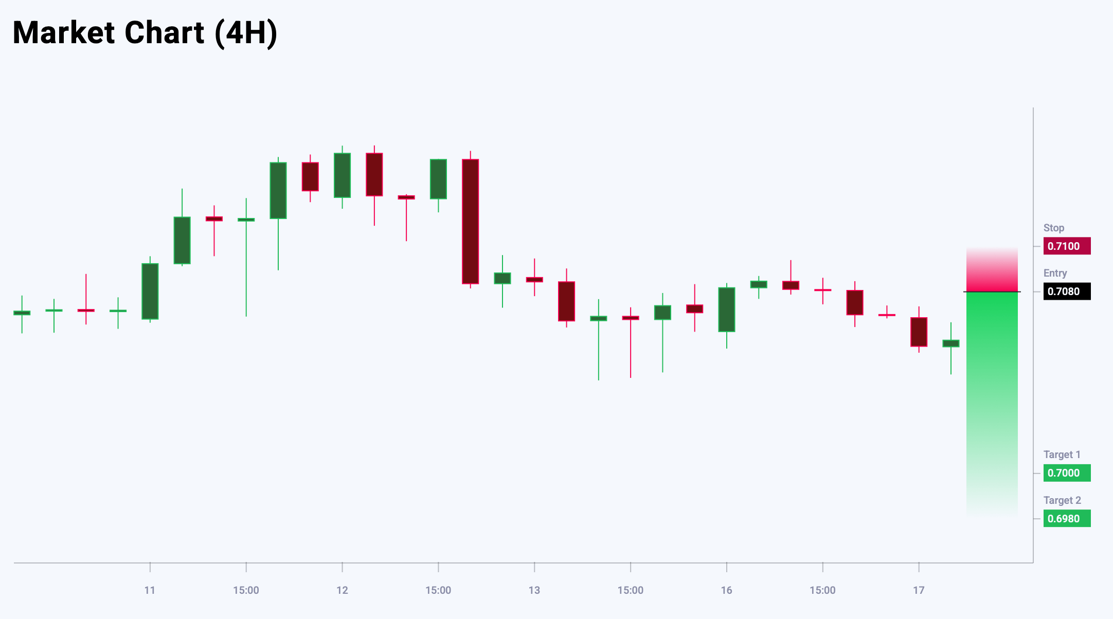 มุมมองของตลาดต่อ AUDUSD แสดงอคติฝั่งขาขึ้นเล็กน้อยที่ 51% เทียบกับ 49% อัตราส่วนความเสี่ยงต่อผลตอบแทนอยู่ที่ 1:5 กำไรที่เป็นไปได้อยู่ที่ 80 pips ที่ระดับทำกำไรแรก และ 100 pips ที่ระดับที่สอง ขณะที่การขาดทุนที่เป็นไปได้ถูกจำกัดไว้ที่ 20 pips