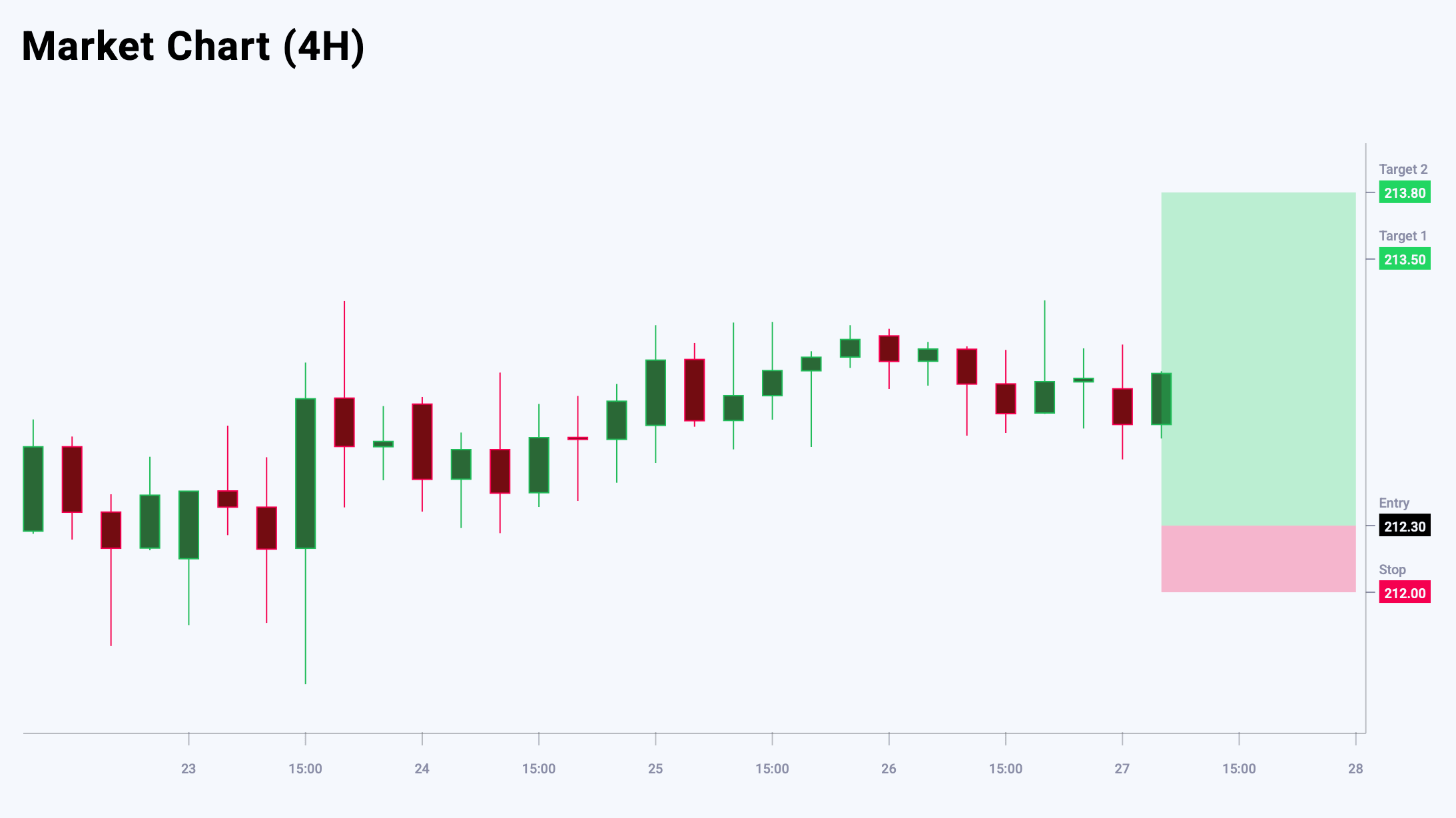 คู่เงิน GBPJPY ยังคงอยู่ในแนวโน้มขาขึ้น อย่างไรก็ตาม ตัวชี้วัด RSI ระยะสั้นกำลังปรับตัวลง ซึ่งบ่งชี้ถึงความเป็นไปได้ของการปรับฐานขาลง ภายใต้สถานการณ์นี้ อัตราส่วนความเสี่ยงต่อผลตอบแทนสำหรับการเปิดสถานะซื้อในระดับปัจจุบันยังไม่เอื้ออำนวย แนวรับสำคัญอยู่ที่ระดับ 212.30 กลยุทธ์ที่เหมาะสมคือซื้อเมื่อราคาย่อตัว แนวคิดการเทรด GBPJPY สำหรับวันนี้แนะนำให้วางคำสั่ง Buy Limit แบบรอดำเนินการ