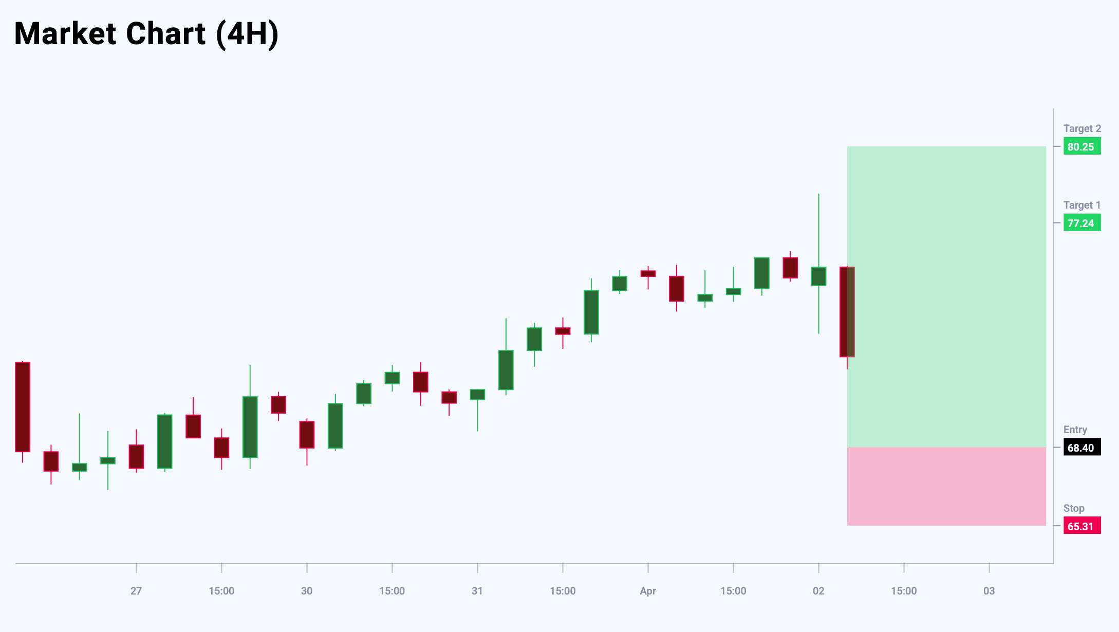XAGUSD กำลังซื้อขายอยู่ในโซนขายมากเกินไป (oversold) ซึ่งบ่งชี้ว่าโมเมนตัมขาลงในปัจจุบันกำลังอ่อนแรงลง แท่งเทียน Doji ที่ก่อตัวจากฐานในระยะสั้นสะท้อนถึงแรงขายที่ลดลงและความเป็นไปได้ของการเปลี่ยนแปลงแนวโน้มในระยะสั้น ในระยะนี้ กลยุทธ์หลักคือการมองหาจังหวะเปิดสถานะซื้อที่มีอัตราส่วนความเสี่ยงต่อผลตอบแทนที่น่าสนใจ อย่างไรก็ตาม ยังมีความเสี่ยงของการย่อตัวในระยะสั้นก่อนที่แนวโน้มขาขึ้นจะพัฒนาอย่างชัดเจน แนวรับสำคัญอยู่ที่ระดับ 68.40 แนวคิดการเทรด XAGUSD สำหรับวันนี้แนะนำให้วางคำสั่ง Buy Limit แบบรอดำเนินการ