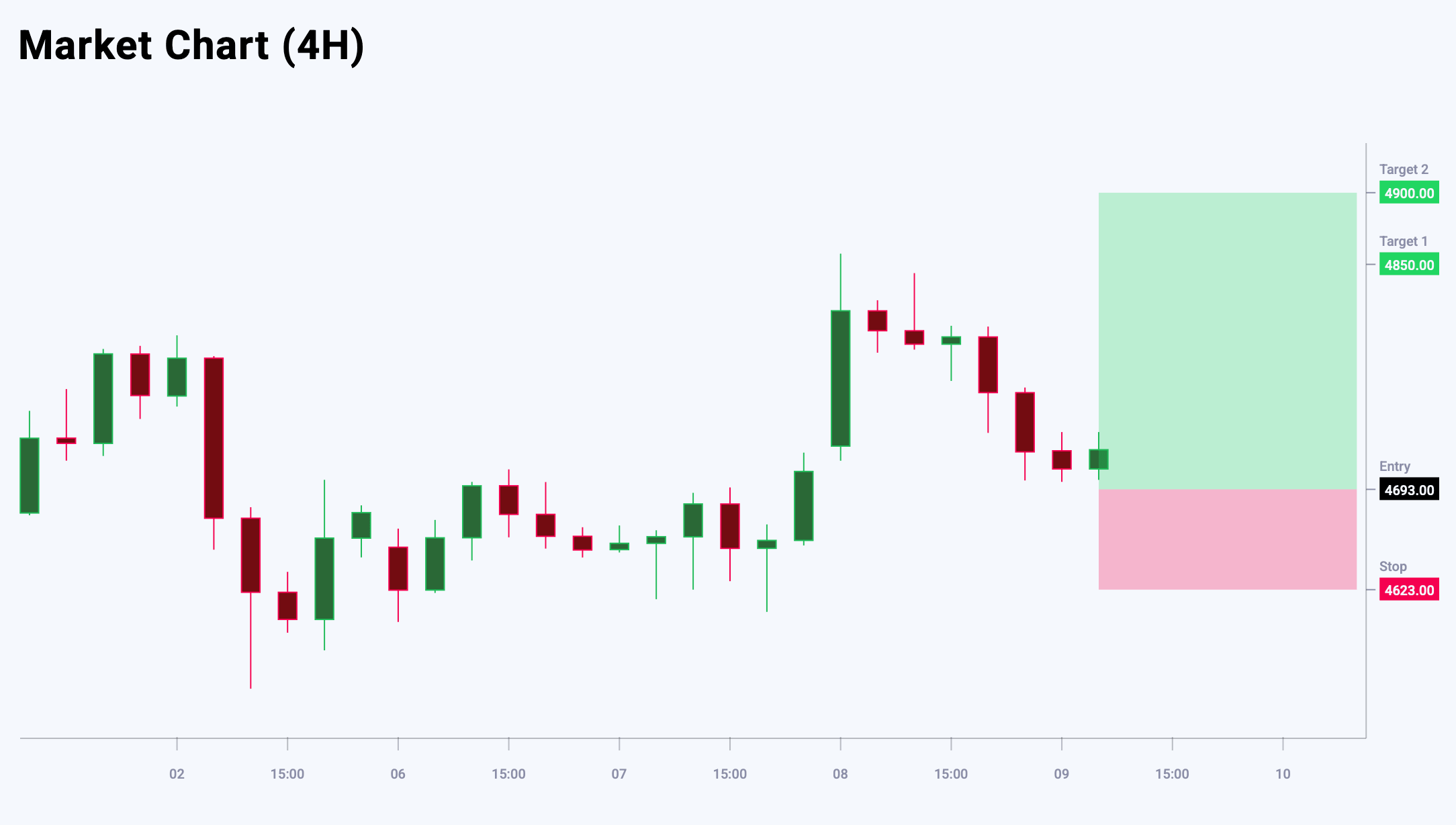 ระดับแนวต้านสำคัญของ XAUUSD อยู่ที่ 4,850 USD ซึ่งก่อนหน้านี้ผู้ขายเคยมีบทบาท การก่อตัวของรูปแบบ Rising Wedge บ่งชี้ถึงความเป็นไปได้ที่โมเมนตัมขาขึ้นกำลังอ่อนแรง รูปแบบนี้มักนำไปสู่การปรับฐาน โดยเฉพาะเมื่อโมเมนตัมเริ่มลดลง แนวรับสำคัญอยู่ที่ 4,693 USD ซึ่งอาจมีแรงซื้อเข้ามาและช่วยจำกัดการปรับลง แนวคิดการเทรด XAUUSD สำหรับวันนี้แนะนำให้วางคำสั่ง Buy Limit แบบรอดำเนินการ